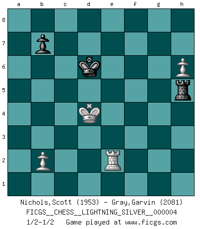 Last move : 1/2-1/2 2010 February 12 18:16:13 [Event "FICGS__CHESS__LIGHTNING_SILVER__000004"] [Site "FICGS"] [Date "2010.02.12"] [Round "1"] [White "Nichols,Scott"] [Black "Gray,Garvin"] [Result "1/2-1/2"] [WhiteElo "1953"] [BlackElo "2081"] 1.e4 e6 2.d4 d5 3.Nd2 Nf6 4.e5 Nfd7 5.f4 c5 6.Ngf3 Nc6 7.Nb3 cxd4 8.Nbxd4 Qb6 9.c3 Bc5 10.g3 Be7 11.Qc2 Nc5 12.Be3 Nxd4 13.Bxd4 a5 14.O-O-O Bd7 15.Kb1 Qc7 16.Bxc5 Bxc5 17.Bd3 a4 18.a3 h6 19.Ka1 O-O-O 20.Rhe1 Kb8 21.Bf1 Rc8 22.Nd4 g5 23.Qd2 Rhg8 24.Bd3 gxf4 25.Qxf4 f5 26.Be2 Qb6 27.Qd2 Be7 28.Bf3 Bc5 29.Bh5 Be8 30.Be2 h5 31.Qf4 Be7 32.Rb1 Bg5 33.Qf2 Be7 34.h4 Bc5 35.Rbc1 Qb3 36.Rcd1 Bb5 37.Rd2 Bxe2 38.Qxe2 Bxd4 39.Rxd4 Rc4 40.Rxc4 Qxc4 41.Qxh5 Rxg3 42.Rd1 Ka7 43.Qe8 d4 44.cxd4 f4 45.d5 f3 46.Qf8 Qb3 47.Qc5+ Ka6 48.Qc1 exd5 49.Rd4 Rg2 50.Rb4 Qc2 51.Qxc2 Rxc2 52.Rxa4+ Kb6 53.Rf4 f2 54.Ka2 Re2 55.e6 Kc6 56.h5 Kd6 57.a4 Kxe6 58.a5 d4 59.h6 Re5 60.Rxf2 Rxa5+ 61.Kb3 Rh5 62.Kc4 Ke5 63.Re2+ Kd6 64.Kxd4 1/2-1/2 Comment by player 2 : Garvin Gray : Enjoy the game! French : Tarrasch, Closed variation Queenside Castling by player White (move 14) Queenside Castling by player Black (move 19) 10 pieces endgame at move 57 : White KRPPP , Black KRPPP WHITE : King + 1 Rook 3 Pawns BLACK : King + 1 Rook 3 Pawns 9 pieces endgame at move 60 : White KRPPP , Black KRPP WHITE : King + 1 Rook 3 Pawns BLACK : King + 1 Rook 2 Pawns 8 pieces endgame at move 60 : White KRPP , Black KRPP WHITE : King + 1 Rook 2 Pawns BLACK : King + 1 Rook 2 Pawns 7 pieces endgame at move 64 : White KRPP , Black KRP WHITE : King + 1 Rook 2 Pawns BLACK : King + 1 Rook 1 Pawn This chess game ended in a draw. Follow this game move after move (download)Chess is war over the board. The object is to crush the opponents mind. (Bobby Fischer) Stelle das Brett so, daß die Sonne in die Augen deines Gegners scheint. (Ruy López) Yo siempre he tenido un ligero sentimiento de lástima por una persona que no tiene conocimiento del Ajedrez. (Siegbert Tarrasch) On a dit que l'homme se distingue de l'animal par le fait qu'il achète plus de livres qu'il ne peut en lire. Je voudrais suggérer qu'inclure à la liste des livres quelques livres d'échecs rendrait la distinction manifeste. (Edward Lasker) Depression is just anger without enthusiasm. (Unknown)
