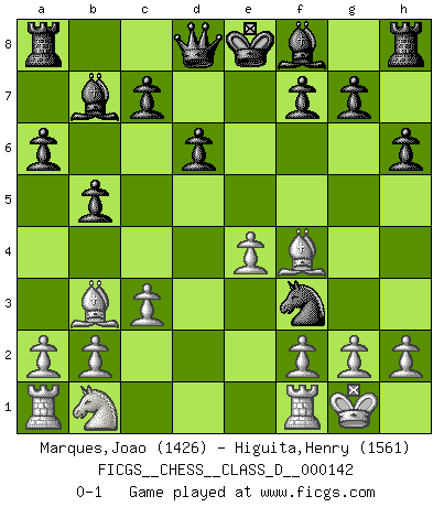 Last move : 0-1 2010 March 12 12:10:49 [Event "FICGS__CHESS__CLASS_D__000142"] [Site "FICGS"] [Date "2010.02.13"] [Round "1"] [White "Marques,Joao"] [Black "Higuita,Henry"] [Result "0-1"] [WhiteElo "1426"] [BlackElo "1561"] 1.e4 e5 2.Nf3 Nc6 3.Bb5 Nge7 4.O-O a6 5.Ba4 b5 6.Bb3 h6 7.c3 Ng6 8.d4 d6 9.dxe5 Ncxe5 10.Nxe5 Nxe5 11.Bf4 Bb7 12.Qf3 Nxf3+ 0-1 Ruy Lopez : Cozio defense Kingside Castling by player White (move 4) Player Black won this chess game. Follow this game move after move (download)Robert Fischer is a law unto himself. (Larry Evans) Wenn Schach ein enormer Dschungel ist, der seine Myriaden von Geheimnissen nicht preisgeben will, dann sind Computer die Kettensägen einer gewaltigen ökologisch unsensiblen Nutzholzfirma. (Nigel Short) No es una movida, aún la mejor movida que tu debas buscar, sino un plan comprensible. (Eugene Znosko-Borovsky) Shah mat. Le roi est mort. Cri de fierté d'un joueur venant de terrasser son adversaire, courtoisement, sans effusion de sang. The Internet is so big, so powerful and pointless that for some people it is a complete substitute for life. (Andrew Brown)
