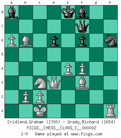 Last move : 1-0 2006 July 16 10:20:44 [Event "FICGS__CHESS__CLASS_C__000002"] [Site "FICGS"] [Date "2006.04.26"] [Round "1"] [White "Cridland,Graham"] [Black "Grady,Richard"] [Result "1-0"] [WhiteElo "1700"] [BlackElo "1654"] 1.e4 c5 2.Nf3 d6 3.d4 cxd4 4.Nxd4 a6 5.Nc3 e6 6.Be3 Nf6 7.g4 h6 8.f3 b5 9.Qd2 Bb7 10.h4 Nbd7 11.Rg1 Be7 12.g5 hxg5 13.hxg5 Ng8 14.O-O-O Rh5 15.g6 f6 16.Nxe6 Qc8 17.Nxg7+ Kd8 18.Nxh5 Ne5 19.f4 Nf3 20.Qd3 Nxg1 21.Bxg1 Qg4 22.Bb6+ Ke8 23.Be2 Qxg6 24.Rg1 Qf7 25.Bg4 Nh6 26.Ng7+ Kf8 27.Ne6+ Ke8 28.Nc7+ Kf8 29.Nxa8 Bxa8 30.Bf3 Ke8 31.a4 Bf8 32.axb5 Bb7 33.bxa6 Ba8 34.Rh1 1-0 Sicilian Queenside Castling by player White (move 14) Player White won this chess game. Follow this game move after move (download)Good positions don't win games, good moves do. (Gerald Abrahams) Wie ich sie so einen nach dem anderen nieder mähte wurde meine Überlegenheit offensichtlich. (José Raúl Capablanca) Algunos sacrificios son sólidos, los demás son míos. (Mikhail Tal) On a dit que l'homme se distingue de l'animal par le fait qu'il achète plus de livres qu'il ne peut en lire. Je voudrais suggérer qu'inclure à la liste des livres quelques livres d'échecs rendrait la distinction manifeste. (Edward Lasker) Think like a man of action, act like a man of thought. (Henri Louis Bergson)