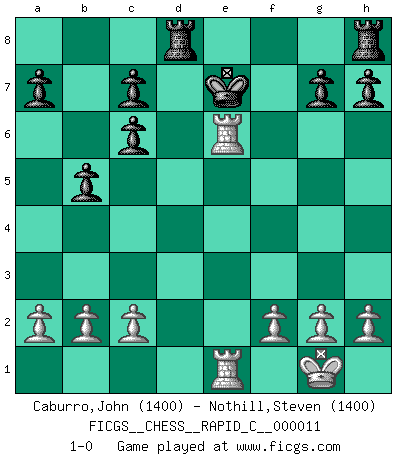 Last move : 1-0 2007 January 8 11:6:31 [Event "FICGS__CHESS__RAPID_C__000011"] [Site "FICGS"] [Date "2006.10.17"] [Round "1"] [White "Caburro,John"] [Black "Nothill,Steven"] [Result "1-0"] [WhiteElo "1400"] [BlackElo "1400"] 1.e4 e5 2.Nf3 Nc6 3.Bb5 Nf6 4.O-O Nxe4 5.d4 Nd6 6.Bxc6 dxc6 7.dxe5 Nf5 8.Qxd8+ Kxd8 9.Nc3 Bb4 10.Bg5+ Be7 11.Rad1+ Bd7 12.e6 fxe6 13.Ne5 Nd6 14.Bxe7+ Kxe7 15.Nxd7 Kxd7 16.Ne4 Ke7 17.Rfe1 Nxe4 18.Rxe4 b5 19.Rde1 Rad8 20.Rxe6+ 1-0 This chess game has been lost on time (started : 2006.10.17 12:0:42) Ruy Lopez : Berlin defense, Open variation Kingside Castling by player White (move 4) Player White won this chess game. Follow this game move after move (download)Chess is a terrible game. If you have no center, your opponent has a freer position. If you do have a center, then you really have something to worry about ! (Siegbert Tarrasch) Alle offensichtlichen Züge sehen nach dem Spiel in der Analyse verdächtig aus. (Viktor Kortschnoi) Cuando tu no sabes absolutamente que mas hacer, es tiempo de entrar en pánico. (John van der Wiel) Les échecs c'est le défi de l'alpiniste, toujours plus haut, prêt à tout pour monter à l'assaut du Roi ennemi. Les échecs, c'est de la musique en mouvement, un ballet majestueux pour les yeux. C'est de la poésie composée par les fantômes du passé qui au même titre que Rimbaud ou Verlaine méritent notre admiration. Les échecs, c'est de la peinture ou le moindre mouvement modifie le tableau pour en faire un Picasso ou un Van Gogh. Les échecs, c'est tout et rien, c'est la vie et la mort. Jjulie33 sur le forum de France-Echecs. Computers are like Old Testament gods; lots of rules and no mercy. (Joseph Campbell)