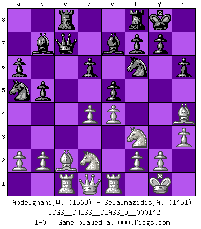 Last move : 1-0 2010 May 23 8:35:28 [Event "FICGS__CHESS__CLASS_D__000142"] [Site "FICGS"] [Date "2010.02.13"] [Round "1"] [White "Abdelghani,Wael"] [Black "Selalmazidis,Arsenis"] [Result "1-0"] [WhiteElo "1563"] [BlackElo "1451"] 1.e4 e5 2.Nf3 Nc6 3.Bb5 a6 4.Ba4 Nf6 5.O-O Be7 6.Re1 b5 7.Bb3 d6 8.c3 O-O 9.h3 Na5 10.Bc2 c5 11.d4 cxd4 12.cxd4 Bb7 13.Bg5 h6 14.Bh4 Qc7 15.Nbd2 Rac8 16.Rc1 1-0 This chess game has been lost on time (started : 2010.02.13 12:22:35) Ruy Lopez : Closed Kingside Castling by player White (move 5) Kingside Castling by player Black (move 8) Player White won this chess game. Follow this game move after move (download)The Pawns are the soul of the game. (Francois Andre Danican Philidor) Lisa Lane, amerikanische Schachmeisterin, hatte Fischer einmal als stärksten lebenden Spieler bezeichnet. Antwort: Das ist richtig, aber Lisa Lane ist eigentlich nicht in der Lage, das zu beurteilen. (Robert James Fischer) Bobby Fischer es el mas grande genio de Ajedrez de todos los tiempos. (Alexander Kotov) Il (Jacob Murray) ne joue pas pour le bon coup, mais pour le meilleur. (Eloi Relange) We need strong personalities and only one world champion to attract sponsors. (Anatoly Karpov)