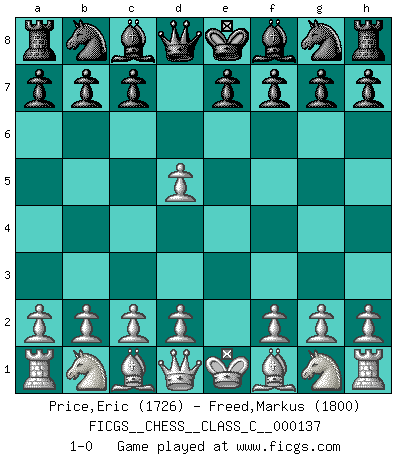 Last move : 1-0 2010 March 27 21:39:56 [Event "FICGS__CHESS__CLASS_C__000137"] [Site "FICGS"] [Date "2010.02.14"] [Round "1"] [White "Price,Eric"] [Black "Freed,Markus"] [Result "1-0"] [WhiteElo "1726"] [BlackElo "1800"] 1.e4 d5 2.exd5 1-0 This chess game has been lost on time (started : 2010.02.14 11:35:34) Scandinavian (centre counter) defense Player White won this chess game. Follow this game move after move (download)Chess is like war on a board. (Bobby Fischer) Es gibt nur zwei wahre Schachgenies - das andere war Wilhelm Steinitz, der Weltmeister von 1872 bis 1894. (Robert James Fischer) Fischer era un maestro de claridad y un Rey del posicionamiento astuto. Sus oponentes podían ver hacia donde se dirigía pero eran impotentes para detenerlo. (Bruce Pandolfini) C'est une question de caractère, Beaucoup de gens perdent leur motivation très vite. D'autres, ils sont rares, peuvent la conserver très longtemps. J'aime les échecs, encore aujourd'hui je suis heureux d'analyser des parties. J'aime toujours gagner, je déteste encore perdre. Bien jouer est important pour mon intégrité intellectuelle et morale. Et puis les échecs vivent en ce moment une période historique grâce à Internet. Ils se développent dans les systèmes éducatifs à travers le monde. Ils sortent de leur ghetto, et c'est mon rôle de mener à bien cette révolution. (Gary Kasparov) Those who make the worst use of their time are the first to complain of its brevity. (Jean de la Bruyere)