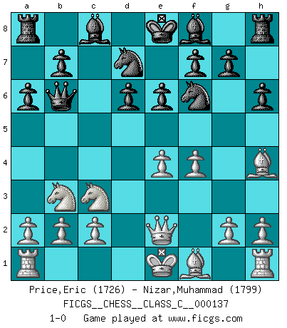 Last move : 1-0 2010 April 20 21:18:11 [Event "FICGS__CHESS__CLASS_C__000137"] [Site "FICGS"] [Date "2010.02.14"] [Round "1"] [White "Price,Eric"] [Black "Nizar,Muhammad"] [Result "1-0"] [WhiteElo "1726"] [BlackElo "1799"] 1.e4 c5 2.Nf3 d6 3.d4 cxd4 4.Nxd4 Nf6 5.Nc3 a6 6.Bg5 e6 7.f4 Qb6 8.Nb3 Nbd7 9.Qe2 h6 10.Bh4 1-0 This chess game has been lost on time (started : 2010.02.14 11:35:34) Sicilian : Najdorf, 7...Qb6 Player White won this chess game. Follow this game move after move (download)A Chess game is divided into three stages: the first, when you hope you have the advantage, the second when you believe you have an advantage, and the third... when you know you're going to lose ! (Savielly Tartakower) Verschiedene, sehr schätzbare und im Laufe des Lebens nützliche Eigenschaften des Geistes können durch das Schachspiel erworben und gekräftigt werden, so dass sie zu Gewohnheiten werden, die uns nie im Stich lassen. (Benjamin Franklin) Cuando tu no sabes absolutamente que mas hacer, es tiempo de entrar en pánico. (John van der Wiel) L'attaque fait le spectacle, la défense gagne les matchs. (Dicton footballistique) A generalist learns less and less about more and more until he knows nothing about everything. (Author unknown)