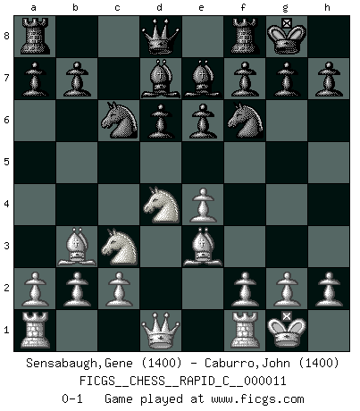 Last move : 0-1 2006 November 28 10:10:58 [Event "FICGS__CHESS__RAPID_C__000011"] [Site "FICGS"] [Date "2006.10.17"] [Round "1"] [White "Sensabaugh,Gene"] [Black "Caburro,John"] [Result "0-1"] [WhiteElo "1400"] [BlackElo "1400"] 1.e4 c5 2.Nf3 d6 3.d4 cxd4 4.Nxd4 Nf6 5.Nc3 e6 6.Bc4 Be7 7.Bb3 O-O 8.O-O Nc6 9.Be3 Bd7 0-1 This chess game has been lost on time (started : 2006.10.17 12:0:42) Sicilian : Sozin attack Kingside Castling by player Black (move 7) Kingside Castling by player White (move 8) Player Black won this chess game. Follow this game move after move (download)Fischer is an American Chess tragedy on par with Morphy and Pillsbury. (Mig Greengard) Oft bringt ein stiller Zug das Erdbeben. (Richard Reti) El Jaque al descubierto es el bombardero del tablero. (Reuben Fine) Les Echecs sont et restent toujours un combat, un combat intégral comme la boxe, la lutte ou un autre sport, et où il doit y avoir un vainqueur et un vaincu. (Joseph Emil Diemer) CHESS, n. f. [echecs, Fr.] A nice and abstruse game, in which two sets of puppets are moved in opposition to each other. (Dr Samuel Johnson, A Dictionary Of The English Language, 1755)