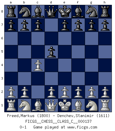 Last move : 0-1 2010 March 26 21:33:12 [Event "FICGS__CHESS__CLASS_C__000137"] [Site "FICGS"] [Date "2010.02.14"] [Round "1"] [White "Freed,Markus"] [Black "Denchev,Stanimir"] [Result "0-1"] [WhiteElo "1800"] [BlackElo "1611"] 1.c4 d5 0-1 This chess game has been lost on time (started : 2010.02.14 11:35:34) English Opening Player Black won this chess game. Follow this game move after move (download)An attack on the wing should be met by play in the center. (Nimzovitch) Je mehr wir mit Computern analysieren, desto mehr glauben wir an Verteidigung. (Vladimir Kramnik) Personalmente, yo prefiero mirar hacia el futuro en donde un programa de computadora gane el título mundial de Ajedrez. La humanidad necesita una lección de humildad. (Richard Dawkings) Un journaliste : 'Vous préférez avoir une dame de plus sur l'échiquier ou au lit ?' Boris Spassky : 'Ca dépend de la position.' 'preceded by its own quotation yields a falsehood' preceded by its own quotation yields a falsehood. (W. V. O. Quine - Set Theory And Its Logic, 1953)