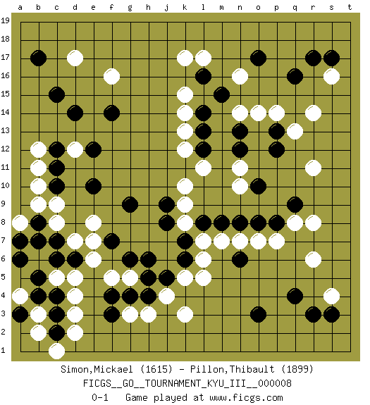 Last move : 0-1 2010 April 14 23:36:27 [Event "FICGS__GO__TOURNAMENT_KYU_III__000008"] [Site "FICGS"] [Date "2010.02.14"] [Round "1"] [Black "Simon,Mickael"] [White "Pillon,Thibault"] [Result "0-1"] [Rating 1 "1615"] [Rating 2 "1899"] 1.q16 d4 2.q4 d17 3.c15 d12 4.d14 f16 5.b17 k17 6.c10 b12 7.f14 c8 8.e10 b10 9.e12 c9 10.c11 b11 11.c12 r14 12.o17 s16 13.r17 r11 14.f3 d2 15.c6 d7 16.c3 d3 17.c4 d5 18.d6 c5 19.b5 e6 20.c7 e8 21.b7 b3 22.c2 b2 23.b4 c1 24.b8 a8 25.a6 a4 26.a3 b9 27.a7 f5 28.h4 r6 29.o3 q8 30.s17 s4 31.r3 k3 32.s3 k5 33.h6 g3 34.g4 h3 35.f4 j4 36.g6 k15 37.k6 l6 38.k7 l7 39.j5 l5 40.l8 k8 41.j8 g5 42.h5 k9 43.j9 k10 44.f7 e7 45.g9 o14 46.m8 n10 47.n6 m7 48.n8 n7 49.o8 o7 50.p8 p7 51.q9 r8 52.o10 n11 53.p12 q13 54.p13 p14 55.n12 l11 56.n13 n14 57.l12 k12 58.l13 k13 59.l14 k14 60.m15 n16 61.l16 l17 0-1 Here are the names of the openings (joseki) played in the four corners : Corner d16 : d17 c15 Komoku (Somok, Xiao~mu`) 3-4 Point. The komoku (3-4) point is the traditional corner enclosure move.. Ikken Kakari (Hankan Keolch'im, Yi Gua`jiao~, 1-Space Low Pincer). The small knight move is the basic approach move to the 3-4 point stone. It has been continually used for over four centuries. There are limitless variations, with new moves constantly being discovered. Black 2 opens the door to a treaure store of joseki. Corner q16 : q16 r14 Hoshi (Hwajeom, Seongjeom, Xingwei`) 4-4 Point. The star or hoshi (4-4) point, emphasizing influence at the potential expense of territory. Ikken Kakari (Hankan Keolch'im, Yi Gua`jiao~, 1-Space Low Approach). White 2 is the standard approach move to the 4-4. Corner q4 : q4 r6 Hoshi (Hwajeom, Seongjeom, Xingwei`) 4-4 Point. The star or hoshi (4-4) point, emphasizing influence at the potential expense of territory. Ikken Kakari (Hankan Keolch'im, Yi Gua`jiao~, 1-Space Low Approach). White 2 is the standard approach move to the 4-4. Player White won this Go (weiqi, baduk) game. Follow this game move after move (download)To reduce an opponent's large prospective territory, strike at the shoulder. (Anonymous) Creativity is allowing yourself to make mistakes. Art is knowing which ones to keep. (Scott Adams)