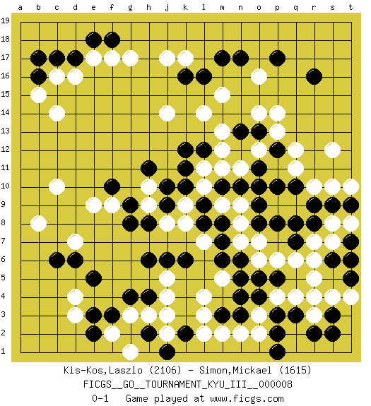 Last move : 0-1 2010 July 12 14:43:57 [Event "FICGS__GO__TOURNAMENT_KYU_III__000008"] [Site "FICGS"] [Date "2010.02.14"] [Round "1"] [Black "Kis-Kos,Laszlo"] [White "Simon,Mickael"] [Result "0-1"] [Rating 1 "2106"] [Rating 2 "1615"] 1.r16 d4 2.q3 d16 3.p17 r5 4.q8 q6 5.p5 q4 6.p3 r3 7.r2 p4 8.o4 o3 9.s3 r4 10.n3 o2 11.p2 n2 12.m3 m2 13.p1 l3 14.n5 m5 15.n6 p6 16.o8 s4 17.s2 r7 18.r8 n7 19.m6 l4 20.n4 o7 21.m7 n8 22.o9 m9 23.k6 k17 24.k2 l2 25.f3 h3 26.h4 g3 27.g4 j4 28.h6 j5 29.j6 f2 30.e3 d3 31.e2 g1 32.e5 c10 33.c6 q12 34.o11 p14 35.m17 g17 36.c17 c16 37.d17 e17 38.e18 f17 39.b16 b15 40.b17 c14 41.f18 r10 42.o13 o14 43.n13 o16 44.n17 m15 45.l16 l14 46.k16 j17 47.l12 j14 48.k10 k8 49.j9 j8 50.h8 h9 51.g8 h10 52.l8 k9 53.l9 l10 54.m10 l11 55.k11 m11 56.n10 m12 57.k12 m13 58.j10 l7 59.m8 n9 60.s6 s8 61.s9 s7 62.r9 o6 63.o5 t6 64.t5 t4 65.t7 t8 66.t6 s10 67.t9 t10 68.q7 r6 69.q10 q11 70.p10 s12 71.p8 n11 72.o10 o12 73.p12 p13 74.h2 j2 75.j1 j3 76.f10 d7 77.d6 b8 78.h11 f9 79.g9 e9 0-1 Here are the names of the openings (joseki) played in the four corners : Corner q4 : q3 r5 Komoku (Somok, Xiao~mu`) 3-4 Point. The komoku (3-4) point is the traditional corner enclosure move.. Ikken Kakari (Hankan Keolch'im, Yi Gua`jiao~, 1-Space Low Pincer). The small knight move is the basic approach move to the 3-4 point stone. It has been continually used for over four centuries. There are limitless variations, with new moves constantly being discovered. White 2 opens the door to a treaure store of joseki. Corner d4 : d4 f3 Hoshi (Hwajeom, Seongjeom, Xingwei`) 4-4 Point. The star or hoshi (4-4) point, emphasizing influence at the potential expense of territory. Ikken Kakari (Hankan Keolch'im, Yi Gua`jiao~, 1-Space Low Approach). Black 2 is the standard approach move to the 4-4. Player White won this Go (weiqi, baduk) game. Follow this game move after move (download)There are players who don't accept exchange: they play many moves that perpetuate a previous state of the game. (Pierre Audouard) I don't know, I don't care, and it doesn't make any difference. (Albert Einstein)