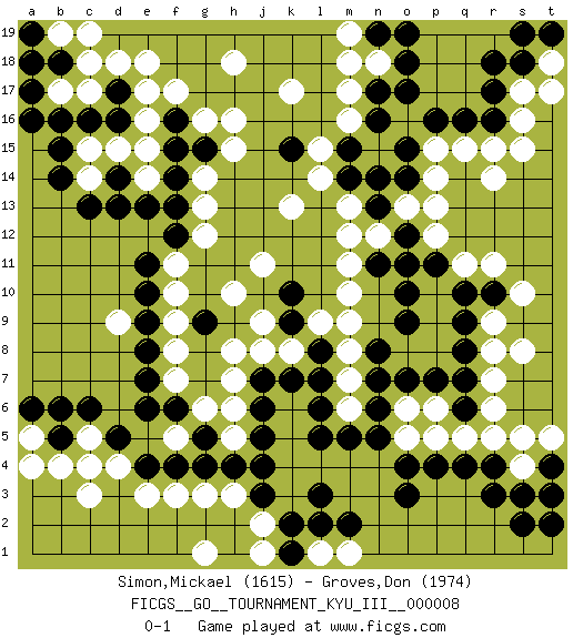 Last move : 0-1 2010 June 7 23:8:13 [Event "FICGS__GO__TOURNAMENT_KYU_III__000008"] [Site "FICGS"] [Date "2010.02.14"] [Round "1"] [Black "Simon,Mickael"] [White "Groves,Don"] [Result "0-1"] [Rating 1 "1615"] [Rating 2 "1974"] 1.q16 e16 2.q4 d4 3.c16 r6 4.o3 s4 5.r3 r9 6.l3 g3 7.c6 b4 8.e6 r14 9.o17 c15 10.b15 c14 11.d16 e15 12.b14 b17 13.b16 e17 14.c13 c17 15.d17 d18 16.d13 d9 17.g9 f7 18.f6 g6 19.g5 h5 20.g4 f5 21.f4 f3 22.e4 e3 23.h4 h7 24.e7 f8 25.e8 f9 26.e9 f10 27.e10 f11 28.e11 k17 29.f12 g12 30.f13 e14 31.e13 p14 32.j5 h6 33.k15 g13 34.f14 k13 35.m14 m12 36.n13 s16 37.r17 o11 38.o12 p12 39.n11 n12 40.p11 o13 41.o10 q11 42.o12 g14 43.o11 m11 44.q10 r11 45.r10 s10 46.q9 s8 47.o9 m9 48.q8 m16 49.o14 p13 50.o15 l14 51.m15 l15 52.n16 p6 53.o7 m7 54.n6 j2 55.d5 c3 56.f15 g16 57.f16 f17 58.g15 h15 59.k7 j8 60.l8 l9 61.k9 k8 62.l7 m8 63.l5 m6 64.m5 o5 65.n5 h18 66.s3 s17 67.s18 m17 68.j7 j9 69.k10 h10 70.a17 m13 71.n14 h3 72.j4 n18 73.o18 r5 74.b5 a18 75.b18 c18 76.a19 t3 77.s2 m1 78.m2 l1 79.l2 r7 80.k1 j1 81.k2 r15 82.j3 g1 83.t2 a5 84.a6 a4 85.t4 t5 86.t3 t18 87.r18 h16 88.r4 s5 89.r16 m10 90.j6 h8 91.s19 o6 92.n7 s15 93.o4 c4 94.q6 q5 95.q7 c5 96.b6 p15 97.p16 q15 98.p7 p5 99.p4 r8 100.n19 m19 101.o19 e18 102.n17 m18 103.t19 t17 104.d14 d15 105.l6 j11 106.n8 c19 107.a16 b19 108.a18 pass 0-1 Here are the names of the openings (joseki) played in the four corners : Corner d16 : e16 c16 Takamoku (Gomok, Gaomu`) 5-4 Point. The takamoku (high) point (5-4). With its emphasis on influence, the 5-4 point complements the 4-4 (hoshi) point in creating an influence-oriented fuseki. Komoku. White responds with 3-3, 3-5, 4-6, 4-7, 3-6, 3-7. Corner q4 : q4 r6 Hoshi (Hwajeom, Seongjeom, Xingwei`) 4-4 Point. The star or hoshi (4-4) point, emphasizing influence at the potential expense of territory. Ikken Kakari (Hankan Keolch'im, Yi Gua`jiao~, 1-Space Low Approach). White 2 is the standard approach move to the 4-4. Corner q16 : q16 r14 Hoshi (Hwajeom, Seongjeom, Xingwei`) 4-4 Point. The star or hoshi (4-4) point, emphasizing influence at the potential expense of territory. Ikken Kakari (Hankan Keolch'im, Yi Gua`jiao~, 1-Space Low Approach). White 2 is the standard approach move to the 4-4. Player White won this Go (weiqi, baduk) game. Follow this game move after move (download)To invade, need 20 points in open area; otherwise, keshi is best. (Yang Yilun, 7p) Some people are so afraid to die that they never begin to live. (Henry Van Dyke)