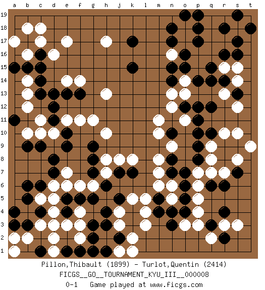 Last move : 0-1 2010 May 30 21:59:34 [Event "FICGS__GO__TOURNAMENT_KYU_III__000008"] [Site "FICGS"] [Date "2010.02.14"] [Round "1"] [Black "Pillon,Thibault"] [White "Turlot,Quentin"] [Result "0-1"] [Rating 1 "1899"] [Rating 2 "2414"] 1.r16 d5 2.q3 e17 3.p17 j3 4.c16 d16 5.c15 c17 6.b17 c18 7.d13 r10 8.r6 r13 9.k17 h17 10.k15 c11 11.c9 e11 12.e9 b18 13.f13 g11 14.c6 c5 15.b5 b4 16.b6 d6 17.d7 e7 18.d8 o3 19.g9 b13 20.c13 e14 21.e13 b14 22.c14 b10 23.b3 h13 24.d11 d10 25.d12 c10 26.e10 f11 27.b9 c3 28.a4 o17 29.o16 n16 30.n17 o18 31.n18 p16 32.o15 q17 33.p18 q18 34.o19 q16 35.q15 p15 36.p14 r15 37.q14 s15 38.r14 s14 39.s13 s12 40.q12 o14 41.n14 o13 42.p12 o11 43.o12 n13 44.n15 n12 45.q10 q9 46.p10 n9 47.p9 q8 48.p8 q7 49.n8 m8 50.n7 p7 51.o7 m7 52.o5 p5 53.o4 p4 54.n3 p3 55.m4 l3 56.q6 p6 57.r4 m6 58.m5 n6 59.o6 n5 60.n4 k5 61.n10 m10 62.p11 m11 63.s17 r17 64.s16 s18 65.r18 q19 66.s19 r19 67.t18 t19 68.r9 s10 69.s19 b12 70.a11 t19 71.s9 s8 72.s19 b16 73.b15 t19 74.r8 r7 75.s19 a17 76.a15 t19 77.s7 t9 78.s19 f14 79.r18 s3 80.p19 q2 81.g3 e3 82.g5 f6 83.h6 h7 84.g7 g6 85.j7 h8 86.j5 l5 87.g8 j8 88.k7 k8 89.h3 j4 90.c4 d4 91.j2 k2 92.c2 d2 93.h4 l4 94.f5 f2 95.e5 e6 96.e4 d3 97.g2 j1 98.h1 h2 99.g1 b2 100.j2 k1 101.c1 a2 102.b1 b4 103.r2 r3 104.c4 d1 105.f1 a1 106.c1 f3 107.e1 f4 108.a3 h10 0-1 Here are the names of the openings (joseki) played in the four corners : Corner d16 : e17 c16 Mokuhazushi (Waemok, Wai`mu`) 5-3 Point. The mokuhazushi (5-3) point was popular in the Edo period in Japan (1600 - 1867). It emphasizes influence; territorially, it is inferior to the 3-4 point. Komoku Kakari. Black 2 is the standard approach because of its solidity and stability. Player White won this Go (weiqi, baduk) game. Follow this game move after move (download)The weak player fears ko, the strong player seeks it. (Bill Taylor) They misunderestimated me. (George W. Bush, Bentonville nov. 6, 2000)