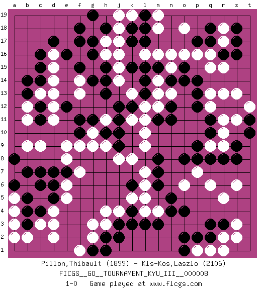 Last move : 1-0 2010 September 8 23:27:13 [Event "FICGS__GO__TOURNAMENT_KYU_III__000008"] [Site "FICGS"] [Date "2010.02.14"] [Round "1"] [Black "Pillon,Thibault"] [White "Kis-Kos,Laszlo"] [Result "1-0"] [Rating 1 "1899"] [Rating 2 "2106"] 1.r16 d4 2.q3 d16 3.p17 r5 4.q8 q6 5.o4 s3 6.k3 r10 7.s8 r13 8.o8 o6 9.s12 s13 10.r12 q12 11.q11 r11 12.p12 q13 13.p13 q15 14.f17 d14 15.k17 g3 16.c12 c9 17.e12 g15 18.c7 e9 19.b4 c3 20.b3 h17 21.c15 d15 22.c14 d13 23.c16 c13 24.b13 d12 25.c11 d11 26.d17 b12 27.b14 b11 28.k15 q16 29.q17 r17 30.s17 r18 31.s16 n16 32.o15 o16 33.m15 o18 34.s18 p16 35.q18 n15 36.n14 m14 37.l14 m13 38.p14 r15 39.n12 m16 40.l15 n13 41.o14 m12 42.n11 k13 43.l13 l12 44.k12 k11 45.j12 l10 46.m8 k8 47.k6 l7 48.m7 l6 49.m6 l5 50.n5 r2 51.q2 s6 52.m3 j4 53.k4 k5 54.j3 h4 55.g16 h16 56.h15 j15 57.h14 j16 58.l17 j14 59.h13 g18 60.f18 j18 61.k18 m18 62.g17 k19 63.l19 j19 64.l18 m19 65.c4 d3 66.d5 e5 67.d6 e6 68.f15 h11 69.g11 g10 70.f11 b2 71.f10 f9 72.h10 g9 73.j11 h9 74.j10 l9 75.e7 f7 76.h2 g2 77.g1 f1 78.h1 d2 79.r3 s2 80.g19 l16 81.h18 j17 82.q10 r9 83.r8 b6 84.b7 a3 85.a6 a5 86.b5 a7 87.c6 a4 88.a6 a2 89.a8 b9 90.t11 s11 91.t10 t12 92.s9 h3 93.j2 f14 94.g14 f13 95.j9 j8 96.m11 l11 97.e16 q1 98.p2 p1 99.o1 r1 100.o2 l4 101.l3 q9 102.p9 p7 103.p8 e8 104.d7 m4 105.n4 1-0 This go game has been lost on time (started : 2010.02.14 15:15:26) Here are the names of the openings (joseki) played in the four corners : Corner q4 : q3 r5 Komoku (Somok, Xiao~mu`) 3-4 Point. The komoku (3-4) point is the traditional corner enclosure move.. Ikken Kakari (Hankan Keolch'im, Yi Gua`jiao~, 1-Space Low Pincer). The small knight move is the basic approach move to the 3-4 point stone. It has been continually used for over four centuries. There are limitless variations, with new moves constantly being discovered. White 2 opens the door to a treaure store of joseki. Corner d16 : d16 f17 Hoshi (Hwajeom, Seongjeom, Xingwei`) 4-4 Point. The star or hoshi (4-4) point, emphasizing influence at the potential expense of territory. Ikken Kakari (Hankan Keolch'im, Yi Gua`jiao~, 1-Space Low Approach). Black 2 is the standard approach move to the 4-4. Player Black won this Go (weiqi, baduk) game. Follow this game move after move (download)Studying go is a wonderful way to develop both the creative as well as the logical abilities of children because to play it both sides of the brain are necessary. (Cho Chikun) Chess, like love, like music, has the power to make people happy. (Siegbert Tarrasch)