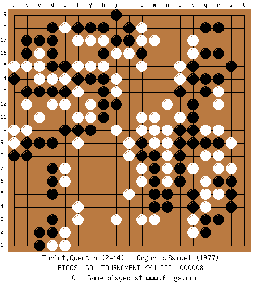 Last move : 1-0 2010 May 19 18:28:50 [Event "FICGS__GO__TOURNAMENT_KYU_III__000008"] [Site "FICGS"] [Date "2010.02.14"] [Round "1"] [Black "Turlot,Quentin"] [White "Grguric,Samuel"] [Result "1-0"] [Rating 1 "2414"] [Rating 2 "1977"] 1.d15 q4 2.d3 p17 3.j17 q10 4.d9 j3 5.d5 f3 6.r16 r13 7.r18 q15 8.q16 p16 9.p15 o15 10.p14 r15 11.q13 r12 12.q18 l17 13.r14 g17 14.l16 m17 15.d17 j18 16.h18 h17 17.k18 j16 18.k17 k16 19.g18 l18 20.j19 l15 21.h16 o14 22.s15 c11 23.c9 b15 24.b16 c16 25.b17 c15 26.d16 d14 27.d13 e14 28.c13 c14 29.b13 e12 30.e13 f13 31.f14 f15 32.g14 g15 33.h14 h15 34.e15 j14 35.h13 f11 36.h11 f9 37.s5 r5 38.s4 r7 39.q3 p3 40.r3 p2 41.r6 q6 42.s6 k5 43.q7 r8 44.p4 p7 45.p5 q5 46.n4 m3 47.m6 b10 48.b9 e7 49.d7 e6 50.d6 k8 51.m4 l3 52.m8 e2 53.d2 f17 54.f18 a9 55.a8 a10 56.b8 s7 57.q2 l7 58.m7 l10 59.l9 k9 60.m10 m11 61.n11 l11 62.o10 p13 63.q14 n9 64.o9 m9 65.l8 n8 66.o8 n7 67.o7 n6 68.n5 l6 69.m5 n10 70.o6 m10 71.p12 j10 72.q9 q8 73.r9 r10 74.p9 s9 75.o13 j13 76.j12 e18 77.d18 d1 78.c1 e1 79.c2 o11 80.p11 n12 81.p10 f4 82.e10 d12 83.f10 g12 84.h12 g11 85.g10 a15 86.c17 b12 87.a14 1-0 Here are the names of the openings (joseki) played in the four corners : Corner q16 : p17 r16 Mokuhazushi (Waemok, Wai`mu`) 5-3 Point. The mokuhazushi (5-3) point was popular in the Edo period in Japan (1600 - 1867). It emphasizes influence; territorially, it is inferior to the 3-4 point. Komoku Kakari. Black 2 is the standard approach because of its solidity and stability. Corner q4 : q4 s5 Hoshi (Hwajeom, Seongjeom, Xingwei`) 4-4 Point. The star or hoshi (4-4) point, emphasizing influence at the potential expense of territory. Player Black won this Go (weiqi, baduk) game. Follow this game move after move (download)Everything happens on a grid-engraved board with black and white pieces, but if that's all you see then you don't know Go. (Pierre Audouard) Looking at the proliferation of personal web pages on the Net, it looks like very soon everyone on Earth will have 15 megabytes of fame. (M.G. Sriram)