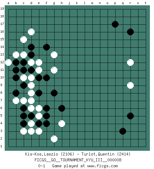 Last move : 0-1 2010 March 29 6:30:7 [Event "FICGS__GO__TOURNAMENT_KYU_III__000008"] [Site "FICGS"] [Date "2010.02.14"] [Round "1"] [Black "Kis-Kos,Laszlo"] [White "Turlot,Quentin"] [Result "0-1"] [Rating 1 "2106"] [Rating 2 "2414"] 1.r16 d16 2.q3 e3 3.p17 r9 4.r5 r12 5.c4 d6 6.e4 d4 7.d5 d3 8.c5 e5 9.f4 c3 10.c6 d7 11.f5 e6 12.b8 g2 13.f6 d9 14.c9 d10 15.c11 h4 16.e8 d8 17.h6 c13 18.d11 e11 19.d13 d12 20.c12 e12 21.d14 c10 22.b10 b13 23.b12 c15 24.f14 a12 25.b11 b7 26.e10 c7 27.f10 g11 28.g8 g13 0-1 Quentin Turlot thanks for the game Here are the names of the openings (joseki) played in the four corners : Corner q4 : q3 r9 Komoku (Somok, Xiao~mu`) 3-4 Point. The komoku (3-4) point is the traditional corner enclosure move.. Corner d4 : e3 c4 Mokuhazushi (Waemok, Wai`mu`) 5-3 Point. The mokuhazushi (5-3) point was popular in the Edo period in Japan (1600 - 1867). It emphasizes influence; territorially, it is inferior to the 3-4 point. Komoku Kakari. Black 2 is the standard approach because of its solidity and stability. Corner d16 : d16 c11 Hoshi (Hwajeom, Seongjeom, Xingwei`) 4-4 Point. The star or hoshi (4-4) point, emphasizing influence at the potential expense of territory. Player White won this Go (weiqi, baduk) game. Follow this game move after move (download)Dead group ? Always win ko fights ! (Anonymous) It is not titles that honor men, but men that honor titles. (Niccolo Machiavelli)