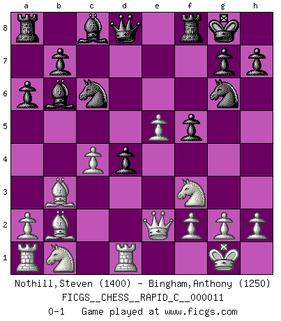 Last move : 0-1 2007 January 13 5:55:41 [Event "FICGS__CHESS__RAPID_C__000011"] [Site "FICGS"] [Date "2006.10.17"] [Round "1"] [White "Nothill,Steven"] [Black "Bingham,Anthony"] [Result "0-1"] [WhiteElo "1400"] [BlackElo "1250"] 1.e4 c5 2.Nf3 Nf6 3.e5 Ng8 4.b4 e6 5.bxc5 Bxc5 6.d4 Bb6 7.Bb5 f6 8.Bb2 a6 9.Ba4 Nc6 10.d5 exd5 11.Qxd5 Nge7 12.Qe4 O-O 13.O-O f5 14.Qe2 d6 15.Bb3+ d5 16.c4 d4 17.Rd1 Ng6 0-1 This chess game has been lost on time (started : 2006.10.17 12:0:42) Sicilian : Nimzovich-Rubinstein variation Kingside Castling by player Black (move 12) Kingside Castling by player White (move 13) Player Black won this chess game. Follow this game move after move (download)I know people who have all the will in the world, but still can't play good Chess. (Bobby Fischer) Die Elozahlen sind sehr schlecht für das Schach. Jetzt ist Schach eine Sportindustrie, die darauf zielt Elopunkte zu machen. (Miguel Najdorf) Debemos de asegurarnos de que el Ajedrez no se convierta en un lenguaje muerto, muy interesante, pero solo para un grupo muy pequeño. (Sytze Faber) Toutes choses étant égales, c'est la conviction qui gagne. Alliée à une volonté de vaincre, elle sert de détonateur, suscite des idées, disperse les doutes et aide à penser clairement. (Robert Fischer) Nowadays, anyone who cannot speak English and is incapable of using the Internet is regarded as backward. (Al-Waleed bin Talal)