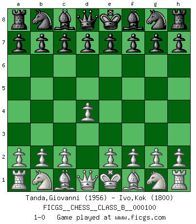 Last move : 1-0 2010 March 28 22:41:51 [Event "FICGS__CHESS__CLASS_B__000100"] [Site "FICGS"] [Date "2010.02.15"] [Round "1"] [White "Tanda,Giovanni"] [Black "Ivo,Kok"] [Result "1-0"] [WhiteElo "1956"] [BlackElo "1800"] 1.d4 1-0 This chess game has been lost on time (started : 2010.02.15 0:3:45) Queen's pawn Player White won this chess game. Follow this game move after move (download)Chess is a foolish expedient for making idle people believe they are doing something very clever when they are only wasting their time. (George Bernard Shaw) Der Vorposten provoziert a) eine Basis für neue Angriffe und b) eine Schwächung der gegnerischen Widerstandskraft in der fraglichen Linie. (Aaron Nimzowitsch) El jugador táctico sabe que hacer cuando hay algo que hacer; mientras que el estratega sabe que hacer cuando no hay nada que hacer. (Gerald Abrahams) Les réformistes prétendent que les progrès de la théorie conduiront à la disparition des échecs, et qu'il faut, pour leur rendre vie, en remanier les règles. En réalité, qu'exprime cette affirmation? Le mépris de l'intuition, de l'imagination et de tous les autres éléments qui font des échecs un art. (Alexander Alekhine) Crush them ! Make them suffer ! (General Grievous in Star Wars ep.3)