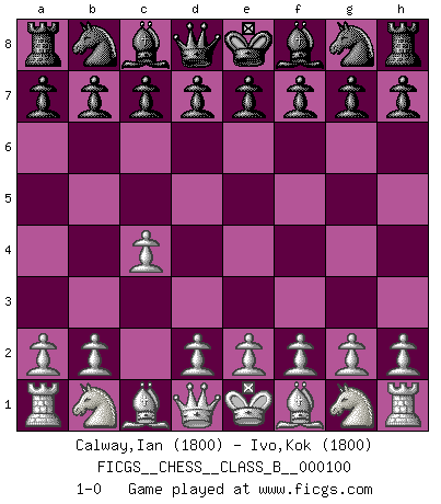 Last move : 1-0 2010 March 27 9:33:44 [Event "FICGS__CHESS__CLASS_B__000100"] [Site "FICGS"] [Date "2010.02.15"] [Round "1"] [White "Calway,Ian"] [Black "Ivo,Kok"] [Result "1-0"] [WhiteElo "1800"] [BlackElo "1800"] 1.c4 1-0 This chess game has been lost on time (started : 2010.02.15 0:3:45) English Opening Player White won this chess game. Follow this game move after move (download)One doesn't have to play well, it's enough to play better than your opponent. (Siegbert Tarrasch) Dieses schreckliche Gefühl, dass ich gegen eine Maschine spielte, die niemals Fehler macht, zerschmetterte meinen Widerstand. (Mark Taimanov) El jugador blanco perdió porque fallo en recordar la coreccta continuación y tuvo que pensar por sí mismo las movidas. (Siegbert Tarrasch) Ne tendez aucun piège pour le plaisir ! Ne jouez rien dans l'espoir que l'adversaire réagisse de façon stupide ! Prenez toujours pour acquis que l'adversaire va trouver le meilleur coup ! Ne jouez jamais de coup dans l'espoir que l'adversaire ne voie pas la menace ! Chacun de vos coups doit améliorer la position d'une façon ou d'une autre. Sometimes it pays to stay in bed in Monday, rather than spending the rest of the week debugging Monday's code. (Dan Salomon)