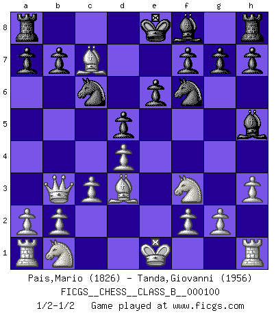 Last move : 1/2-1/2 2010 February 24 16:28:44 [Event "FICGS__CHESS__CLASS_B__000100"] [Site "FICGS"] [Date "2010.02.15"] [Round "1"] [White "Pais,Mario"] [Black "Tanda,Giovanni"] [Result "1/2-1/2"] [WhiteElo "1826"] [BlackElo "1956"] 1.e4 c6 2.d4 d5 3.exd5 cxd5 4.Nf3 Nf6 5.Bd3 Bg4 6.c3 Nc6 7.h3 Bh5 8.Bf4 e6 9.Qb3 Qc7 10.Bxc7 1/2-1/2 Caro-Kann : Exchange variation This chess game ended in a draw. Follow this game move after move (download)Nonsense was the last thing Fischer was interested in, as far as Chess was concerned. (Elie Agur) Sie führen leise Selbstgespräche, schlürfen lautstark ihre Getränke, schmatzen hörbar beim Essen, blasen ihrem Gegenüber Rauch in die Augen, niesen ihm ins Gesicht, starren ihn unverwandt an, bis er sich unter ihren Blicken windet, rutschen ständig auf ihrem Stuhl hin und her, rülpsen und bohren in der Nase. (Anonymous) La partida mas dura de ganar es una partida ganada. (Emanuel Lasker) Les Echecs sont et restent toujours un combat, un combat intégral comme la boxe, la lutte ou un autre sport, et où il doit y avoir un vainqueur et un vaincu. (Joseph Emil Diemer) Depression is just anger without enthusiasm. (Unknown)