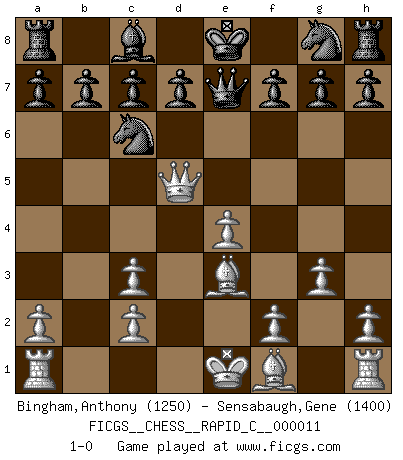 Last move : 1-0 2006 November 30 4:23:6 [Event "FICGS__CHESS__RAPID_C__000011"] [Site "FICGS"] [Date "2006.10.17"] [Round "1"] [White "Bingham,Anthony"] [Black "Sensabaugh,Gene"] [Result "1-0"] [WhiteElo "1250"] [BlackElo "1400"] 1.e4 e5 2.Nf3 Nc6 3.d4 exd4 4.Nxd4 Qh4 5.Nc3 Bb4 6.Bd2 Nxd4 7.g3 Qe7 8.Be3 Bxc3+ 9.bxc3 Nc6 10.Qd5 1-0 This chess game has been lost on time (started : 2006.10.17 12:0:42) Scotch : Steinitz variation Player White won this chess game. Follow this game move after move (download)Chess is a sea in which a gnat may drink and an elephant may bathe. (Hindu proverb) Am wohlsten fühle ich mich, wenn ich sehe, wie sich mein Gegner im Todeskampf windet. (Robert James Fischer) El muchacho (en ese entonces un niño de 12 años llamado Anatoly Karpov) no tiene ni idea de lo que es el Ajedrez y no hay futuro en absoluto para el en esta profesión. (Mikhail Botvinnik) Je ne crois pas en la psychologie, je crois aux bons coups. (Robert Fischer) Two beer, or not two beer. (Unknown)