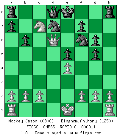 Last move : 1-0 2006 October 27 21:11:31 [Event "FICGS__CHESS__RAPID_C__000011"] [Site "FICGS"] [Date "2006.10.17"] [Round "1"] [White "Mackey,Jason"] [Black "Bingham,Anthony"] [Result "1-0"] [WhiteElo "0800"] [BlackElo "1250"] 1.e4 c5 2.Nf3 d6 3.d4 Nf6 4.Nc3 cxd4 5.Nxd4 e5 6.Bb5+ Bd7 7.Bxd7+ Nbxd7 8.Nf5 g6 9.Nxd6+ Bxd6 10.Qxd6 b6 11.Bg5 h6 12.Nd5 hxg5 13.Nc7+ 1-0 Sicilian Player White won this chess game. Follow this game move after move (download)The older I grow, the more I value pawns. (Paul Keres) Auf jeden Fall musst du zuerst Rechtsanwalt werden, damit du deine eigenen Interessen und die deiner Familie vertreten kannst. [Brief an seinen Sohn] (José Raúl Capablanca) La última cosa en que Fischer estaba interesado era en tonterías, siempre y cuando el Ajedrez estuviera involucrado. (Elie Agur) La victoire dans une partie d'Echecs appartient la plupart du temps à celui qui voit un peu plus loin que l'adversaire. (Lasker) If you work for a living, why do you kill yourself working ? (Tuco to a chicken in The Good, The Bad and The Ugly)