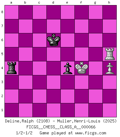 Last move : 1/2-1/2 2010 April 28 8:25:42 [Event "FICGS__CHESS__CLASS_A__000066"] [Site "FICGS"] [Date "2010.02.17"] [Round "1"] [White "Deline,Ralph"] [Black "Muller,Henri-Louis"] [Result "1/2-1/2"] [WhiteElo "2108"] [BlackElo "2025"] 1.e4 c5 2.c3 d5 3.exd5 Qxd5 4.d4 Nf6 5.Nf3 e6 6.Be2 Nc6 7.Na3 cxd4 8.Nb5 Qd8 9.Nbxd4 Nxd4 10.Nxd4 Bc5 11.Bf4 O-O 12.O-O Qb6 13.Nb3 Rd8 14.Qc2 Be7 15.Bf3 Bd7 16.Nd4 Nd5 17.Bg3 Bf6 18.Rfd1 Be8 19.Qb3 Qxb3 20.Nxb3 Rac8 21.a4 b6 22.h3 h6 23.Be2 a5 24.Ba6 Ra8 25.Bb7 Ra7 26.Bxd5 Rxd5 27.Rxd5 exd5 28.Bf4 Ra8 29.Be3 Bd7 30.Nd4 Re8 31.b3 Be7 32.Rd1 Bc5 33.Rd3 f6 34.f3 Kf7 35.Kf2 h5 36.h4 Re5 37.Rd2 Re8 38.Rb2 Ba3 39.Rc2 Bc5 40.Rd2 g6 41.Rd1 Re5 42.Rb1 Re8 43.b4 axb4 44.cxb4 Be7 45.a5 bxa5 46.bxa5 Ra8 47.Rb7 Ke8 48.Bd2 Kd8 49.Rb1 Bd6 50.Ke3 Ra6 51.f4 Bc5 52.Rc1 Ba3 53.Rc2 Ke7 54.Kd3 Kd6 55.f5 gxf5 56.Ra2 Bc5 57.Rb2 Ke7 58.Rb7 f4 59.Nb3 Bd6 60.Bb4 Bxb4 61.Rxb4 Bf5+ 62.Kd4 Ra8 63.Rb7+ Kd6 64.Rb6+ Ke7 65.a6 Be4 66.Na5 Bxg2 67.a7 f3 68.Ke3 Kd7 69.Rxf6 Kc7 70.Rc6+ Kd7 71.Rh6 Kc7 72.Rxh5 f2 73.Kxf2 Be4 74.Nb3 Rxa7 75.Nc5 Kd6 76.Nxe4+ dxe4 77.Ke3 Ra4 78.Kf4 1/2-1/2 Sicilian : Alapin's variation (2.c3) Kingside Castling by player Black (move 11) Kingside Castling by player White (move 12) 10 pieces endgame at move 72 : White KRNPP , Black KRBPP WHITE : King + 1 Rook 1 Knight 2 Pawns BLACK : King + 1 Rook 1 Bishop 2 Pawns 9 pieces endgame at move 73 : White KRNPP , Black KRBP WHITE : King + 1 Rook 1 Knight 2 Pawns BLACK : King + 1 Rook 1 Bishop 1 Pawn 8 pieces endgame at move 74 : White KRNP , Black KRBP WHITE : King + 1 Rook 1 Knight 1 Pawn BLACK : King + 1 Rook 1 Bishop 1 Pawn 7 pieces endgame at move 76 : White KRNP , Black KRP WHITE : King + 1 Rook 1 Knight 1 Pawn BLACK : King + 1 Rook 1 Pawn 6 pieces endgame at move 76 : White KRP , Black KRP WHITE : King + 1 Rook 1 Pawn BLACK : King + 1 Rook 1 Pawn This chess game ended in a draw. Follow this game move after move (download)If one piece is badly posted, the whole game is bad. (Tarrasch) Frage: Gibt es etwas was Sie mehr lieben als Autobahnen ohne Tempobegrenzungen? - Antwort: Deutsche Frauen ohne Tempobegrenzungen. (Loek van Wely) Aunque la mayoría de la gente disfruta observar las partidas de los grandes Maestros de ataque, algunos de los jugadores mas notables en la historia han sido los jugadores silenciosos posicionales. Lentamente ellos te aplastan despojandote de tu espacio, congestionando tus piezas y dejandote virtualmente sin nada que hacer. (Yasser Seirawan) Vouloir jouer aux échecs contre soi-même est aussi paradoxal que vouloir marcher sur son ombre. (Stefan Zweig) Follow your passion, and success will follow you. (Arthur Buddhold)