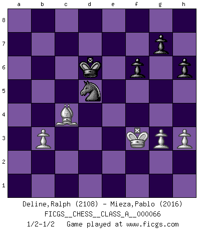 Last move : 1/2-1/2 2010 March 17 6:56:14 [Event "FICGS__CHESS__CLASS_A__000066"] [Site "FICGS"] [Date "2010.02.17"] [Round "1"] [White "Deline,Ralph"] [Black "Mieza,Pablo"] [Result "1/2-1/2"] [WhiteElo "2108"] [BlackElo "2016"] 1.e4 e5 2.Nf3 Nc6 3.Bb5 Nf6 4.O-O Be7 5.Re1 d6 6.d4 exd4 7.Nxd4 Bd7 8.Nc3 O-O 9.Bf1 Ne5 10.h3 Re8 11.Be3 Bf8 12.Nf3 c6 13.a4 Qa5 14.Nd2 Ng6 15.Nc4 Qc7 16.Bd4 Ne5 17.a5 h6 18.Qd2 Be6 19.Ne3 b5 20.axb6 axb6 21.Rxa8 Rxa8 22.f4 b5 23.Ned5 Bxd5 24.exd5 b4 25.Nd1 Ned7 26.dxc6 Qxc6 27.Qxb4 Qxc2 28.Qc3 Qa4 29.b3 Qa3 30.Ne3 d5 31.Ra1 Qxa1 32.Qxa1 Rxa1 33.Bxa1 Bd6 34.Bb5 Bxf4 35.Nxd5 Nxd5 36.Bxd7 Be3+ 37.Kh2 Bf4+ 38.g3 Bd2 39.Be5 Bc3 40.Bb8 Bb4 41.Bb5 Kf8 42.Kg2 Ke7 43.Kf3 Bd6 44.Bxd6+ Kxd6 45.Bc4 f6 1/2-1/2 Ruy Lopez : Berlin defense, 4.O-O Kingside Castling by player White (move 4) Kingside Castling by player Black (move 8) 10 pieces endgame at move 44 : White KBPPP , Black KNPPP WHITE : King + 1 Bishop 3 Pawns BLACK : King + 1 Knight 3 Pawns This chess game ended in a draw. Follow this game move after move (download)One of these modest little moves may be more embarrassing to your opponent than the biggest threat. (Siegbert Tarrasch) Kein Großmeister ist normal. Sie unterscheiden sich nur im Ausmaß Ihrer Verrücktheit. (Viktor Kortschnoi) Me dio la sensación de como si yo estuviera jugando en contra del mismo Ajedrez. - al estar jugando en contra de Robert Fischer (Walter Shipman) Toute estimation doit être constamment réévaluée. (Jacob Estrin) Yoga is 99% practice and 1% knowledge. (Sri Krishna Pattabhi Jois)