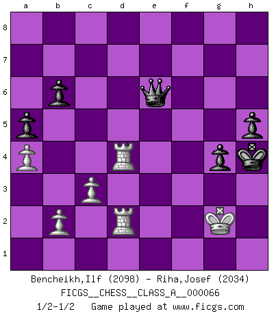 Last move : 1/2-1/2 2010 March 17 15:33:53 [Event "FICGS__CHESS__CLASS_A__000066"] [Site "FICGS"] [Date "2010.02.17"] [Round "1"] [White "Bencheikh,Ilf"] [Black "Riha,Josef"] [Result "1/2-1/2"] [WhiteElo "2098"] [BlackElo "2034"] 1.d4 Nf6 2.Bg5 e6 3.e3 c5 4.Nd2 cxd4 5.exd4 Be7 6.Ngf3 b6 7.c3 Bb7 8.Bd3 d6 9.O-O Nbd7 10.h3 O-O 11.a4 Nd5 12.Bxe7 Qxe7 13.g3 N7f6 14.Ng5 h6 15.Nge4 e5 16.Qb3 Qd7 17.Kh2 Bc8 18.Nxf6+ Nxf6 19.g4 Bb7 20.Rfe1 Rae8 21.Ne4 Nxe4 22.Bxe4 Bxe4 23.Rxe4 exd4 24.Rxd4 Re2 25.Kg3 Qe7 26.Qb5 Re8 27.Rb1 Rxf2 28.Qxe8+ Qxe8 29.Kxf2 Qe5 30.Rh1 f5 31.Kf3 Kh7 32.Kf2 a6 33.Kf3 d5 34.Kf2 a5 35.Kf3 g5 36.gxf5 Qxf5+ 37.Kg3 Qe5+ 38.Kf2 Qe6 39.h4 g4 40.Rhd1 Qf6+ 41.Kg1 Qxh4 42.Rxd5 Qg3+ 43.Kf1 Qf3+ 44.Kg1 Kg6 45.R1d3 Qe4 46.R5d4 Qe1+ 47.Kg2 Kg5 48.Rd2 h5 49.Rd5+ Kh4 50.R5d4 Qe5 51.Rd5 Qg3+ 52.Kh1 Qf3 53.Kg1 Qe4 54.R5d4 Qb1 55.Kg2 Qe1 56.Rf2 Qe6 57.Rfd2 1/2-1/2 Ilf Bencheikh I was lucky to save this one! Poor opening, poor play :-( Trompowsky attack (Ruth, Opovcensky Opening) Kingside Castling by player White (move 9) Kingside Castling by player Black (move 10) This chess game ended in a draw. Follow this game move after move (download)Fischer was a master of clarity and a king of artful positioning. His opponents would see where he was going but were powerless to stop him. (Bruce Pandolfini) Wir irren allesamt, nur jeder irrt anders. (Georg Christoph Lichtenberg) Prefiero perder una partida realmente buena, que ganar una mala. (David Levy) Comme les marins qui ont mille raisons différentes d'aller en mer, les joueurs d'échecs en ont tout autant avant de s'installer devant une table et jouer... (Vincent Bertignac, philosophe) I find your interest interesting. (Gregory House, House M.D.)