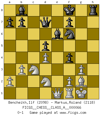 Last move : 0-1 2010 May 23 22:32:53 [Event "FICGS__CHESS__CLASS_A__000066"] [Site "FICGS"] [Date "2010.02.17"] [Round "1"] [White "Bencheikh,Ilf"] [Black "Markus,Roland"] [Result "0-1"] [WhiteElo "2098"] [BlackElo "2118"] 1.d4 Nf6 2.Bg5 d5 3.Bxf6 exf6 4.e3 Be6 5.g3 f5 6.Bg2 c6 7.Ne2 Nd7 8.O-O g5 9.Nd2 Bd6 10.b3 h5 11.c4 h4 12.cxd5 cxd5 13.Nc3 hxg3 14.hxg3 Nf6 15.Rc1 Rc8 16.Nb5 Bb8 17.Rxc8 Qxc8 18.Qc1 Qd7 19.Nc3 f4 20.exf4 gxf4 21.Qe1 Kf8 0-1 Trompowsky attack (Ruth, Opovcensky Opening) Kingside Castling by player White (move 8) Player Black won this chess game. Follow this game move after move (download)You are for me the Queen on d8 and I am the Pawn on d7 !! (Eduard Gufeld) Ein Teil des Fehlers ist immer korrekt. (Savielly Grigorievitsch Tartakower) Yo no creo en la psicología. Yo creo en las buenas movidas. (Bobby Fischer) Si rien de grave n'est détecté lors de l'analyse d'une position, on joue alors le coup. Seconde règle de Blumenfeld. Fear is the path to the dark side. Fear leads to anger; anger leads to hate; hate leads to suffering. I sense much fear in you. (Master Yoda in Star Wars ep.1)