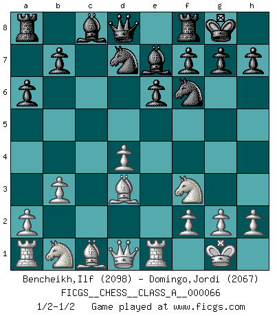 Last move : 1/2-1/2 2010 March 16 20:1:38 [Event "FICGS__CHESS__CLASS_A__000066"] [Site "FICGS"] [Date "2010.02.17"] [Round "1"] [White "Bencheikh,Ilf"] [Black "Domingo,Jordi"] [Result "1/2-1/2"] [WhiteElo "2098"] [BlackElo "2067"] 1.d4 d5 2.c4 dxc4 3.e3 Nf6 4.Bxc4 e6 5.Nf3 c5 6.O-O a6 7.Bd3 Nbd7 8.Re1 Be7 9.b3 cxd4 10.exd4 O-O 1/2-1/2 Queen's gambit accepted Kingside Castling by player White (move 6) Kingside Castling by player Black (move 10) This chess game ended in a draw. Follow this game move after move (download)When I asked Fischer why he had not played a certain move in our game, he replied: 'Well, you laughed when I wrote it down !' (Mikhail Tal) Das Spiel gibt uns die Genugtuung, die das Leben uns versagt. (Emanuel Lasker) Te sientas frente a un tablero y repentinamente tu corazón brinca. Tu mano tiembla al tomar una pieza y moverla. Pero lo que el Ajedrez te enseña es que tu debes permanecer ahí con calma y pensar de que si realmente es una buena idea o de que si hay otras ideas mejores. (Stanley Kubrick) La menace est plus forte que l'exécution. (Aaron Nimzovitch) It's not the will to win, but the will to prepare to win that makes the difference. (Bear Bryant)