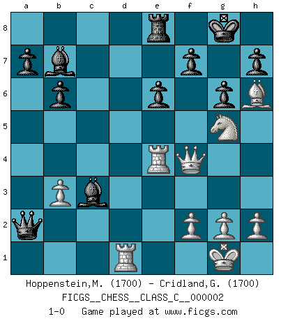 Last move : 1-0 2006 July 5 23:45:56 [Event "FICGS__CHESS__CLASS_C__000002"] [Site "FICGS"] [Date "2006.04.26"] [Round "1"] [White "Hoppenstein,Michael"] [Black "Cridland,Graham"] [Result "1-0"] [WhiteElo "1700"] [BlackElo "1700"] 1.d4 Nf6 2.Nf3 g6 3.e3 Bg7 4.Bd3 O-O 5.O-O d5 6.Nbd2 c5 7.c3 b6 8.e4 dxe4 9.Nxe4 Bb7 10.Nxf6+ Bxf6 11.Bh6 Re8 12.Bb5 Nd7 13.dxc5 Nxc5 14.Bxe8 Qxe8 15.Re1 Rd8 16.Qc2 Qc6 17.Rad1 Re8 18.Qd2 e6 19.Qd6 Qa4 20.Qf4 Ne4 21.b3 Qxa2 22.Rxe4 Bxc3 23.Ng5 1-0 King's Indian : East Indian defense Kingside Castling by player Black (move 4) Kingside Castling by player White (move 5) Player White won this chess game. Follow this game move after move (download)Combinations have always been the most intriguing aspect of Chess. The masters look for them, the public applauds them, the critics praise them. It is because combinations are possible that Chess is more than a lifeless mathematical exercise. They are the poetry of the game; they are to Chess what melody is to music. They represent the triumph of mind over matter. (Reuben Fine) Sie führen leise Selbstgespräche, schlürfen lautstark ihre Getränke, schmatzen hörbar beim Essen, blasen ihrem Gegenüber Rauch in die Augen, niesen ihm ins Gesicht, starren ihn unverwandt an, bis er sich unter ihren Blicken windet, rutschen ständig auf ihrem Stuhl hin und her, rülpsen und bohren in der Nase. (Anonymous) Tu no necesitas jugar muy bien, únicamente ayudar a tu oponenet a que juegue muy mal. (Genrikh Chepukaitis) Les Echecs mettent en conflit, non pas deux intelligences, mais deux volontés. (Lasker) Memory is a way of holding onto the things you love, the things you are, the things you never want to lose. (from the television show: The Wonder Years)