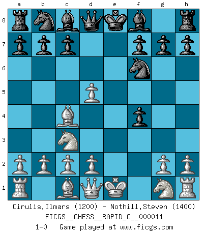 Last move : 1-0 2007 January 8 17:9:42 [Event "FICGS__CHESS__RAPID_C__000011"] [Site "FICGS"] [Date "2006.10.17"] [Round "1"] [White "Cirulis,Ilmars"] [Black "Nothill,Steven"] [Result "1-0"] [WhiteElo "1200"] [BlackElo "1400"] 1.e4 e5 2.f4 exf4 3.Bc4 d5 4.exd5 Nf6 5.Nc3 1-0 This chess game has been lost on time (started : 2006.10.17 12:0:42) KGA : Bishop's gambit, Bledow variation Player White won this chess game. Follow this game move after move (download)A player surprised is half beaten. (Proverb) Obwohl ich vom Stil her kaum zu den Priestern der Schachkunst gezählt werde, halte ich Schach doch für eine Kunst. (Tigran Petrosjan) Nunca nadie ha ganado una partida de Ajedrez rindiendose. (Unknown) La menace est plus forte que l'exécution. (Aaron Nimzovitch) The real danger is not that computers will begin to think like men, but that men will begin to think like computers. (Sydney J. Harris)