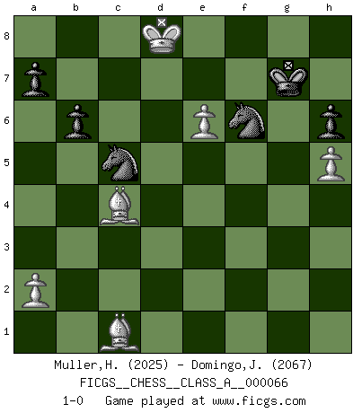 Last move : 1-0 2010 November 13 15:38:41 [Event "FICGS__CHESS__CLASS_A__000066"] [Site "FICGS"] [Date "2010.02.17"] [Round "1"] [White "Muller,Henri-Louis"] [Black "Domingo,Jordi"] [Result "1-0"] [WhiteElo "2025"] [BlackElo "2067"] 1.e4 e5 2.Nf3 f5 3.Nxe5 Qf6 4.d4 d6 5.Nc4 fxe4 6.Nc3 Qg6 7.f3 exf3 8.Qxf3 Be7 9.Nd5 Bd8 10.Bd3 Qg4 11.Qe3+ Qe6 12.O-O Qxe3+ 13.Ncxe3 Nc6 14.c3 Be6 15.Nf5 Bxf5 16.Bxf5 Nge7 17.Re1 O-O 18.Be6+ Kh8 19.Nf4 Ng8 20.Bc4 Bf6 21.Ne6 Rfe8 22.Bd2 Re7 23.g3 Na5 24.Bd3 d5 25.b3 b6 26.Kg2 Nb7 27.Ng5 Bxg5 28.Bxg5 Rxe1 29.Rxe1 h6 30.Bf4 Nd6 31.Re5 g5 32.Bc1 Re8 33.h4 gxh4 34.gxh4 Rxe5 35.dxe5 Nb7 36.c4 c6 37.b4 Nd8 38.b5 dxc4 39.bxc6 Nxc6 40.Bxc4 Nge7 41.Bb2 Na5 42.Ba6 Nd5 43.Kf3 Nc7 44.Bf1 Kg7 45.Ke4 Nb7 46.h5 Nc5+ 47.Kf5 Nd5 48.e6 Kf8 49.Bc1 Ne7+ 50.Ke5 Ng8 51.Bc4 Kg7 52.Kd6 Ne4+ 53.Kd7 Nc5+ 54.Ke8 Nf6+ 55.Kd8 1-0 Latvian counter-gambit Kingside Castling by player White (move 12) Kingside Castling by player Black (move 17) Player White won this chess game. Follow this game move after move (download)Bobby is the most misunderstood, misquoted celebrity walking the face of this earth. (Yasser Seirawan) Zeige mir drei Eröffnungsvarianten und ich beweise dir, dass zwei davon inkorrekt sind. (Emanuel Lasker) Después de una mala apertura, hay una esperanza en el juego medio. Pero una vez que estas en finales, el momento de la verdad ha llegado. (Edmar Mednis) La vie et les Echecs sont tous les deux une lutte constante. (Lasker) You must do what you feel is right... of course. (Obi-Wan Kenobi in Star Wars ep.4)