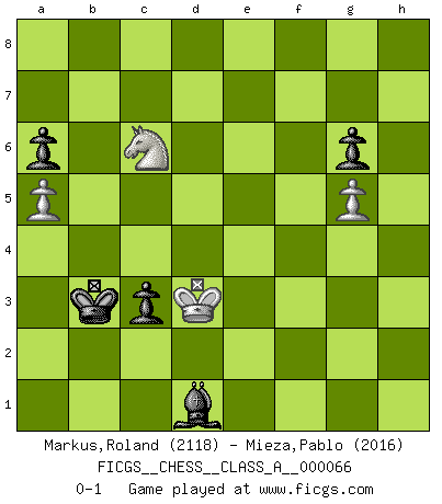 Last move : 0-1 2010 August 25 19:51:29 [Event "FICGS__CHESS__CLASS_A__000066"] [Site "FICGS"] [Date "2010.02.17"] [Round "1"] [White "Markus,Roland"] [Black "Mieza,Pablo"] [Result "0-1"] [WhiteElo "2118"] [BlackElo "2016"] 1.e4 e5 2.Nf3 Nc6 3.Bb5 Nf6 4.O-O Be7 5.Nc3 d6 6.d4 exd4 7.Nxd4 Bd7 8.Re1 O-O 9.Bxc6 bxc6 10.Qd3 Re8 11.h3 c5 12.Nf3 Bc6 13.Nd5 h6 14.Bd2 Nxd5 15.exd5 Bb7 16.Rab1 c6 17.b4 cxd5 18.bxc5 Qd7 19.Bf4 dxc5 20.Ne5 Qc8 21.Bxh6 Bf8 22.Bf4 d4 23.Qc4 Re7 24.Bg3 Ba6 25.Qd5 Qd8 26.Qf3 Qe8 27.Nd3 Rc8 28.Bd6 Rxe1+ 29.Rxe1 Qc6 30.Qxc6 Rxc6 31.Bxf8 Kxf8 32.Ne5 Rd6 33.a4 Bc8 34.g4 Re6 35.Kf1 Ba6+ 36.Kg1 Ke8 37.Kg2 f6 38.Nd3 Rxe1 39.Nxe1 Ke7 40.Kg3 Kd6 41.Kf4 Bc8 42.a5 c4 43.h4 Kc5 44.Nf3 Bd7 45.g5 Ba4 46.Ne1 fxg5+ 47.hxg5 g6 48.Ke4 a6 49.f4 Bd7 50.Ke5 Bg4 51.f5 Bxf5 52.Nf3 Bxc2 53.Nxd4 Bd1 54.Ke4 c3 55.Kd3 Kb4 56.Nc6+ Kb3 0-1 Ruy Lopez : Berlin defense, 4.O-O Kingside Castling by player White (move 4) Kingside Castling by player Black (move 8) 10 pieces endgame at move 52 : White KNPP , Black KBPPPP WHITE : King + 1 Knight 2 Pawns BLACK : King + 1 Bishop 4 Pawns 9 pieces endgame at move 53 : White KNPP , Black KBPPP WHITE : King + 1 Knight 2 Pawns BLACK : King + 1 Bishop 3 Pawns Player Black won this chess game. Follow this game move after move (download)You need not play well - just help your opponent to play badly. (Genrikh Chepukaitis) Wenn ich mich einlogge, glauben die Leute gewöhnlich nicht, dass ich es selbst bin und sie fangen an, mir dumme Fragen zu stellen. Und wenn sie es glauben, stellen sie wieder andere dumme Fragen. (Judith Polgar) Si el ingenio solamente fuese necesario para lucirse, las mujeres serían las mejores jugadoras de Ajedrez del mundo. (Albin) Le profane ne songe pas à la somme de jouissance dont il se prive, qui méconnaît ce jeu aux ressources aussi variées que passionnantes. (Jean-Marie Jeanton-Lamarche) Men never do evil so completely and cheerfully as when they do it from religious conviction. (Blaise Pascal)
