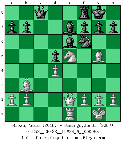 Last move : 1-0 2010 June 12 8:42:6 [Event "FICGS__CHESS__CLASS_A__000066"] [Site "FICGS"] [Date "2010.02.17"] [Round "1"] [White "Mieza,Pablo"] [Black "Domingo,Jordi"] [Result "1-0"] [WhiteElo "2016"] [BlackElo "2067"] 1.d4 d5 2.c4 dxc4 3.e3 e5 4.Bxc4 exd4 5.exd4 Nf6 6.Nf3 Be7 7.O-O O-O 8.Nc3 Nbd7 9.Re1 Nb6 10.Bb3 c6 11.Bg5 Nbd5 12.Nxd5 cxd5 13.Ne5 Be6 14.Rc1 Rc8 15.Rxc8 Qxc8 16.Qe2 1-0 This chess game has been lost on time (started : 2010.02.17 18:59:23) Queen's gambit accepted Kingside Castling by player White (move 7) Kingside Castling by player Black (move 7) Player White won this chess game. Follow this game move after move (download)The game of Chess is not merely an idle amusement; several very valuable qualities of the mind are to be acquired and strengthened by it, so as to become habits ready on all occasions; for life is a kind of Chess. (Benjamin Franklin) Kasparov ist eine Art Monster mit hundert Augen, denen auch nicht das Geringste entgeht. (Tony Miles) Todos los Maestros de Ajedrez fueron un día unos principiantes. (Chernev) L'ordinateur a tué l'originalité. Il n'y a plus guère d'aventures sur l'échiquier. (Jacob Murray) The quality of decision is like the well-timed swoop of a falcon which enables it to strike and destroy its victim. (Sun Tzu)