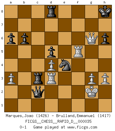 Last move : 0-1 2010 May 7 13:39:4 [Event "FICGS__CHESS__RAPID_D__000035"] [Site "FICGS"] [Date "2010.02.19"] [Round "1"] [White "Marques,Joao"] [Black "Brulland,Emmanuel"] [Result "0-1"] [WhiteElo "1426"] [BlackElo "1417"] 1.e4 c6 2.d4 d5 3.exd5 cxd5 4.Nf3 Nf6 5.Bb5+ Bd7 6.Bxd7+ Qxd7 7.O-O e6 8.Nc3 Be7 9.Ne5 Qd8 10.Bf4 Nbd7 11.Nxd7 Qxd7 12.Qf3 Bd6 13.Bxd6 Qxd6 14.a3 a6 15.Rfe1 O-O 16.Na4 b6 17.Rad1 Rac8 18.Nc3 Rfd8 19.Rd3 Qe7 20.Re5 Nd7 21.Re2 Qf6 22.Qg3 g6 23.R2e3 Qg7 24.Kf1 h6 25.Qf4 Nf6 26.Re2 Nh5 27.Qd2 g5 28.g3 Rc4 29.Qe3 Nf6 30.f4 Ng4 31.Qf3 f5 32.h3 Nf6 33.fxg5 Qxg5 34.Rxe6 Ne4 35.Re5 Qc1+ 36.Qd1 Qxb2 37.Rxf5 Rxc3 38.Qg4+ Kh8 39.Qg6 Qc1+ 40.Kg2 Qxc2+ 0-1 Caro-Kann : Exchange variation Kingside Castling by player White (move 7) Kingside Castling by player Black (move 15) Player Black won this chess game. Follow this game move after move (download)A great player and a great example for many. His book My 60 Memorable Games had a big impact on me. It is a shame he didn't continue to enrich the world of chess with his unparalleled understanding after 1972. (Jan Timman, about Bobby Fischer's death) Ich organisiere ein großes Turnier, was mich etwa 120000 Dollar kostet. Ich denke, das ist das erste Mal in der Schachgeschichte, daß ein Schachgroßmeister auch als Mäzen auftritt. (Miguel Najdorf) El Ajedrez te enseña a controlarl la excitación inicial que sientes cuando vez algo que parece bueno y te enseña a pensar objetivamente cuando te encuentras en problemas. (Stanley Kubrick) Les échecs, c'est l'imagination. (David Bronstein) Internal peace cannot coexist with external war. (Don Groves)