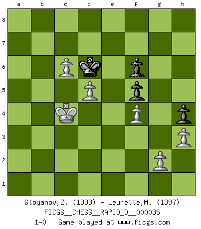 Last move : 1-0 2010 March 2 17:40:15 [Event "FICGS__CHESS__RAPID_D__000035"] [Site "FICGS"] [Date "2010.02.19"] [Round "1"] [White "Stoyanov,Zdravko"] [Black "Leurette,Marc-Antoine"] [Result "1-0"] [WhiteElo "1333"] [BlackElo "1397"] 1.e4 e5 2.Nf3 Nc6 3.Bb5 Nf6 4.Bxc6 dxc6 5.h3 Nxe4 6.Qe2 Nf6 7.Qxe5+ Qe7 8.Qxe7+ Bxe7 9.d3 O-O 10.O-O Be6 11.Bg5 b5 12.Nd4 Bd5 13.Nc3 b4 14.Nxd5 cxd5 15.Nc6 Rfe8 16.Nxe7+ Rxe7 17.Bxf6 gxf6 18.Rfe1 Rae8 19.Rxe7 Rxe7 20.Kf1 Kf8 21.a3 a5 22.axb4 axb4 23.Ra4 c5 24.Ra5 c4 25.Rxd5 c3 26.Rb5 Ra7 27.bxc3 bxc3 28.Rc5 Ra3 29.Ke2 Kg7 30.d4 Kg6 31.Kd3 f5 32.Rxc3 Rxc3+ 33.Kxc3 h5 34.d5 Kf6 35.Kc4 Ke7 36.Kc5 Kd7 37.c4 h4 38.f4 Kc7 39.Kd4 f6 40.c5 Kd7 41.c6+ Kd6 42.Kc4 1-0 Ruy Lopez : Berlin defense Kingside Castling by player Black (move 9) Kingside Castling by player White (move 10) 10 pieces endgame at move 33 : White KPPPPP , Black KPPP WHITE : King + 5 Pawns BLACK : King + 3 Pawns Player White won this chess game. Follow this game move after move (download)No price is too great for the scalp of the enemy King. (Koblentz) Ich habe Putins Aufstieg an die Macht beobachtet und seine Politik, die demokratischen Institutionen meines Landes zu zerstören. (Garry Kasparov) Para mi, el Ajedrez es la vida y cada partida es como una nueva vida. Todo jugador de Ajedrez suele vivir muchas vidas durante su vida. (Eduard Gufeld) Avec des compensations pour le matériel en plus... (Anonyme) All battles are fought by scared men who'd rather be someplace else. (John Wayne in the movie In harm's way)