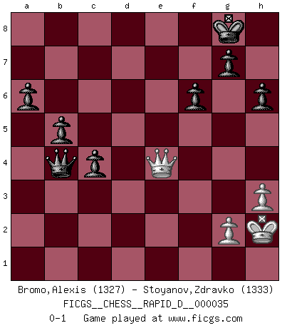 Last move : 0-1 2010 March 23 19:18:33 [Event "FICGS__CHESS__RAPID_D__000035"] [Site "FICGS"] [Date "2010.02.19"] [Round "1"] [White "Bromo,Alexis"] [Black "Stoyanov,Zdravko"] [Result "0-1"] [WhiteElo "1327"] [BlackElo "1333"] 1.d4 d5 2.c4 dxc4 3.e3 b5 4.Nc3 a6 5.b4 e6 6.Nf3 Nf6 7.a3 c6 8.h3 Nd5 9.Nxd5 cxd5 10.Be2 Bd6 11.Bb2 O-O 12.Bc3 Nd7 13.Qc2 Nf6 14.O-O Ne4 15.Ne5 Bxe5 16.dxe5 h6 17.f3 Ng3 18.Rf2 Nf5 19.e4 Nh4 20.f4 d4 21.Bb2 d3 22.Bxd3 Qb6 23.Be2 Ng6 24.f5 exf5 25.exf5 Nxe5 26.Bxe5 Re8 27.Bc3 f6 28.Rd1 Bxf5 29.Qxf5 Rxe2 30.Kf1 R2e8 31.Qg6 Re6 32.Re1 Rxe1+ 33.Kxe1 Qe3+ 34.Kf1 Qxc3 35.Rf3 Qe5 36.Kf2 Re8 37.Qc2 Qd4+ 38.Kg3 Re3 39.Rxe3 Qxe3+ 40.Kh2 Qxa3 41.Qe4 Qxb4 0-1 Queen's gambit accepted Kingside Castling by player Black (move 11) Kingside Castling by player White (move 14) Player Black won this chess game. Follow this game move after move (download)What is the difference between chess and football? Everybody understands football, but nobody plays it. Everybody plays chess, but nobody understands it. Everything is relative. (Vladimir Kramnik) Wenn Capablanka heute auf der Schachbühne erscheinen würde, hätte er ein halbes Jahr gebraucht um sich die Schachtheorie anzueignen. Und dann hätte er alles und jeden besiegt. (Mikhail Moiseyevich Botvinik) Yo he agregado estos principios a la ley: pongan los Caballos en acción antes de que los dos Alfiles sean desarrollados. (Emanuel Lasker) Aucun coup ne doit être joué sans but. (Pedro Damiano) Somewhere in the world there is an epigram for every dilemma. (Hendrik Willem van Loon)