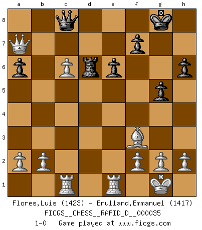 Last move : 1-0 2010 March 7 14:58:57 [Event "FICGS__CHESS__RAPID_D__000035"] [Site "FICGS"] [Date "2010.02.19"] [Round "1"] [White "Flores,Luis"] [Black "Brulland,Emmanuel"] [Result "1-0"] [WhiteElo "1423"] [BlackElo "1417"] 1.e4 c6 2.d4 d5 3.Nd2 e6 4.Ngf3 dxe4 5.Nxe4 Nd7 6.Bc4 Ngf6 7.Neg5 h6 8.Nh3 Nb6 9.Be2 Be7 10.c3 O-O 11.Nf4 Nbd5 12.Nd3 Re8 13.O-O a6 14.Re1 b6 15.Nfe5 Nd7 16.Nxc6 Qc7 17.Nxe7+ Rxe7 18.c4 N5f6 19.Bf3 Bb7 20.Bf4 Qd8 21.Bxb7 Ra7 22.Bf3 Qc8 23.Rc1 g5 24.Bg3 Qd8 25.Ne5 Nxe5 26.Bxe5 Nd7 27.Bd6 Re8 28.c5 bxc5 29.dxc5 Qc8 30.c6 Nb6 31.Qd4 Rd8 32.Qxb6 Rxd6 33.Qxa7 1-0 Caro-Kann : 3.Nd2 Kingside Castling by player Black (move 10) Kingside Castling by player White (move 13) Player White won this chess game. Follow this game move after move (download)A strong memory, concentration, imagination, and a strong will is required to become a great Chess player. (Bobby Fischer) Sie bekommen vielleicht den Eindruck, dass die Spitzenspieler überhaupt gar nicht so stark sind. Aber das stimmt nicht. Es ist eine Illusion. Mit einem Computer an der Seite ist es sehr leicht, Urteile zu fällen, aber wenn man alleine am Brett sitzt, sieht die Sache ganz anders aus. (Vladimir Kramnik) Puntos débiles o agujeros en la posición de tu oponente deben de ser ocupados por piezas, no Peones. (Siegbert Tarrasch) Les erreurs sont comme les malheurs, elles n'arrivent jamais seules. (Siegbert Tarrasch) Computers make it easier to do a lot of things, but most of the things they make it easier to do don't need to be done. (Andy Rooney)