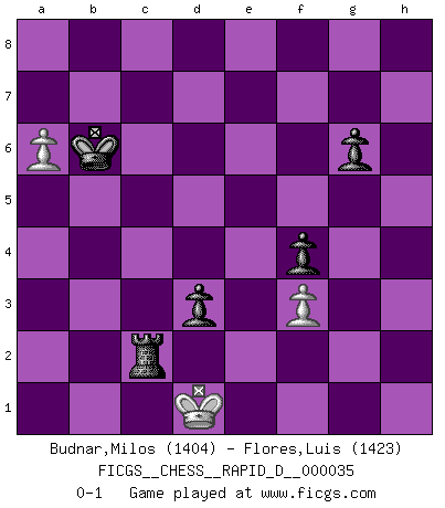 Last move : 0-1 2010 May 25 13:25:40 [Event "FICGS__CHESS__RAPID_D__000035"] [Site "FICGS"] [Date "2010.02.19"] [Round "1"] [White "Budnar,Milos"] [Black "Flores,Luis"] [Result "0-1"] [WhiteElo "1404"] [BlackElo "1423"] 1.e4 c5 2.Nf3 Nc6 3.d4 cxd4 4.Nxd4 e5 5.Nxc6 bxc6 6.Bc4 Nf6 7.Nc3 Bb4 8.Qf3 d5 9.exd5 cxd5 10.Bb5+ Bd7 11.Bxd7+ Qxd7 12.O-O O-O 13.a3 e4 14.Qe2 Bxc3 15.bxc3 Rfc8 16.Bb2 Rab8 17.Rfb1 Rb6 18.Bc1 Rxc3 19.Rxb6 axb6 20.Bb2 Rc4 21.Bxf6 gxf6 22.h3 Qc6 23.Ra2 d4 24.f3 e3 25.g3 b5 26.Kg2 Rc3 27.g4 Qc4 28.Qxc4 bxc4 29.Kf1 d3 30.cxd3 cxd3 31.Ra1 Rc2 32.Rd1 e2+ 33.Ke1 exd1Q+ 34.Kxd1 Kf8 35.a4 Ke8 36.h4 Kd7 37.g5 f5 38.h5 f4 39.a5 Kc6 40.a6 Kb6 41.g6 fxg6 42.hxg6 hxg6 0-1 Sicilian : Labourdonnais-Loewenthal variation Kingside Castling by player White (move 12) Kingside Castling by player Black (move 12) Promotion Queen by player Black (move 33) 10 pieces endgame at move 41 : White KPPP , Black KRPPPP WHITE : King + 3 Pawns BLACK : King + 1 Rook 4 Pawns 9 pieces endgame at move 42 : White KPPP , Black KRPPP WHITE : King + 3 Pawns BLACK : King + 1 Rook 3 Pawns 8 pieces endgame at move 42 : White KPP , Black KRPPP WHITE : King + 2 Pawns BLACK : King + 1 Rook 3 Pawns Player Black won this chess game. Follow this game move after move (download)Some sacrifices are sound; the rest are mine. (Mikhail Tal) Ein unbeabsichtigtes Patt ist der Gipfel der Dummheit. (Anonymous) Una buena memoria, concentración, imaginación y una fuerte voluntad, se requiere para llegar a ser un buen jugador. (Bobby Fischer) Les ravages du H expliquent la différence de niveau entre Tal et Thal [Abergel]. A married woman is like a fish riding a bicycle. (Rodolfo d'Ettorre)