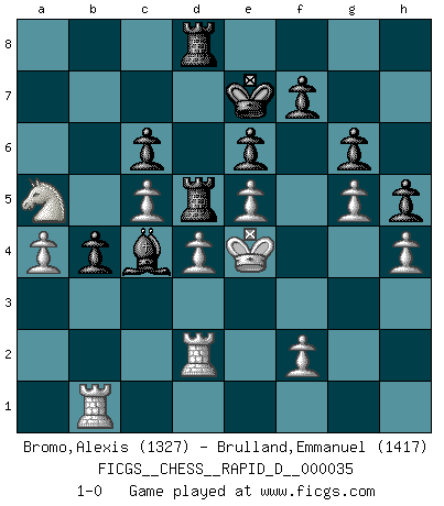 Last move : 1-0 2010 March 29 19:54:30 [Event "FICGS__CHESS__RAPID_D__000035"] [Site "FICGS"] [Date "2010.02.19"] [Round "1"] [White "Bromo,Alexis"] [Black "Brulland,Emmanuel"] [Result "1-0"] [WhiteElo "1327"] [BlackElo "1417"] 1.d4 d5 2.e3 Nf6 3.c4 c6 4.Nc3 e6 5.Nf3 Nbd7 6.b3 Bb4 7.Bd2 dxc4 8.Bxc4 O-O 9.O-O Nb6 10.a3 Bxc3 11.Bxc3 Nxc4 12.bxc4 Ne4 13.Qd3 Nxc3 14.Qxc3 Qe7 15.e4 Rd8 16.Rfd1 b6 17.e5 Bb7 18.c5 b5 19.Rab1 a6 20.Qc2 g6 21.g3 a5 22.Qd2 Rd5 23.Qh6 Qf8 24.Qg5 Rad8 25.h4 h6 26.Qf6 Qg7 27.Qxg7+ Kxg7 28.Kf1 Ba6 29.Kg2 R8d7 30.g4 Kf8 31.Kg3 Ke7 32.Kf4 Rd8 33.g5 h5 34.Ke4 Rb8 35.Nd2 b4 36.a4 Rbd8 37.Nb3 Be2 38.Rd2 Bc4 39.Nxa5 1-0 Queen's pawn game Kingside Castling by player Black (move 8) Kingside Castling by player White (move 9) Player White won this chess game. Follow this game move after move (download)Chess is a foolish expedient for making idle people believe they are doing something very clever when they are only wasting their time. (George Bernard Shaw) Versuche, dich von der Sklaverei der Eröffnungsvarianten zu befreien. Stattdessen soll man gewisse Typenpositionen erlernen, die man eingehend analysiert. (Aaron Nimzowitsch) Tu puedes aprender mucho mas de una partida que pierdas que de una partida ganada. Tendras que perder cientos de partidas antes de llegar a ser un buen jugador. (Jose Raul Capablanca) Avant la finale, les dieux ont créé le milieu de partie. (Tarrasch) Internet: Absolute communication, absolute isolation. (Paul Carvel)
