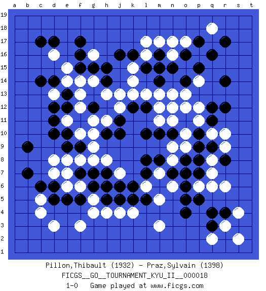 Last move : 1-0 2010 March 30 18:49:47 [Event "FICGS__GO__TOURNAMENT_KYU_II__000018"] [Site "FICGS"] [Date "2010.02.19"] [Round "1"] [Black "Pillon,Thibault"] [White "Praz,Sylvain"] [Result "1-0"] [Rating 1 "1932"] [Rating 2 "1398"] 1.q16 d16 2.q4 d3 3.d5 c5 4.c6 c4 5.d6 f3 6.d10 r10 7.c14 o17 8.r14 r6 9.o4 m3 10.o6 q6 11.l5 k4 12.k5 j4 13.j5 h4 14.r8 q8 15.f17 e15 16.c17 q18 17.r17 l17 18.d17 g16 19.f16 d13 20.d14 e14 21.e13 f13 22.e12 n8 23.g15 g14 24.f15 f14 25.h15 g11 26.l8 e11 27.d12 f12 28.d11 f8 29.g6 h8 30.q9 r9 31.p8 q7 32.p9 r3 33.r4 s4 34.q3 s2 35.e10 f10 36.l10 d8 37.b9 f6 38.f5 e6 39.e5 g5 40.g7 d7 41.f7 e7 42.h5 g4 43.b7 h6 44.h7 j7 45.j6 g8 46.h6 j13 47.e9 e8 48.m16 m17 49.f9 g9 50.h10 g10 51.j11 l13 52.o16 n16 53.n15 n17 54.m15 k15 55.k16 l16 56.l15 k14 57.j16 n13 58.o14 m11 59.m10 n11 60.n10 p11 61.q11 q10 62.p10 p12 63.r12 h11 64.j10 q2 65.k12 k13 66.l12 m12 67.m14 m13 68.o12 o13 69.o11 p14 70.q12 p16 71.p15 o15 72.h14 h13 73.o16 o10 74.p17 n12 75.o11 o9 76.o8 n9 77.n7 o7 78.p7 p6 79.o7 m7 80.m8 o12 81.p5 j12 82.g12 n6 83.o5 m5 84.l7 l6 85.k6 1-0 Here are the names of the openings (joseki) played in the four corners : Corner d4 : d3 d5 Komoku (Somok, Xiao~mu`) 3-4 Point. The komoku (3-4) point is the traditional corner enclosure move.. Ikken Takagakari (Hankan Nop'dakeolch'im, Yi Gaogua`jiao~, 1-Space High Approach). The 5-4 approach move has become more popular in modern times, as modern Go emphasizes speed and influence. Corner d16 : d16 c14 Hoshi (Hwajeom, Seongjeom, Xingwei`) 4-4 Point. The star or hoshi (4-4) point, emphasizing influence at the potential expense of territory. Ikken Kakari (Hankan Keolch'im, Yi Gua`jiao~, 1-Space Low Approach). Black 2 is the standard approach move to the 4-4. Corner q16 : q16 o17 Hoshi (Hwajeom, Seongjeom, Xingwei`) 4-4 Point. The star or hoshi (4-4) point, emphasizing influence at the potential expense of territory. Ikken Kakari (Hankan Keolch'im, Yi Gua`jiao~, 1-Space Low Approach). White 2 is the standard approach move to the 4-4. Corner q4 : q4 r6 Hoshi (Hwajeom, Seongjeom, Xingwei`) 4-4 Point. The star or hoshi (4-4) point, emphasizing influence at the potential expense of territory. Ikken Kakari (Hankan Keolch'im, Yi Gua`jiao~, 1-Space Low Approach). White 2 is the standard approach move to the 4-4. Player Black won this Go (weiqi, baduk) game. Follow this game move after move (download)A basic: Don't push too hard. (Jansteen) The meaning of life is that it is to be lived, and it is not to be traded and conceptualized and squeezed into a pattern of systems. (Bruce Lee)