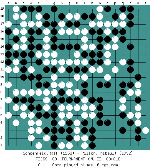 Last move : 0-1 2010 April 12 21:44:31 [Event "FICGS__GO__TOURNAMENT_KYU_II__000018"] [Site "FICGS"] [Date "2010.02.19"] [Round "1"] [Black "Schoenfeld,Ralf"] [White "Pillon,Thibault"] [Result "0-1"] [Rating 1 "1253"] [Rating 2 "1932"] 1.q16 d17 2.q3 d4 3.q9 o17 4.r14 q18 5.r17 l16 6.d15 c15 7.d16 c16 8.d14 c14 9.d13 e17 10.c13 c8 11.c10 e8 12.e10 k4 13.m3 m5 14.o4 d3 15.g3 k2 16.j3 k3 17.e2 d2 18.j2 f2 19.g2 e3 20.f3 e1 21.g5 j6 22.g7 f8 23.h8 g9 24.g11 k8 25.e5 d5 26.e6 h9 27.n6 m6 28.n7 h6 29.g6 h4 30.j4 h5 31.h3 j8 32.k5 j5 33.k1 l2 34.g4 h1 35.g1 j1 36.d6 c6 37.d7 d8 38.c7 b6 39.b7 b8 40.b5 c5 41.a6 b4 42.j7 k6 43.k7 l7 44.h7 l5 45.l8 j9 46.m7 l6 47.n4 f7 48.m2 f6 49.f5 e4 50.m1 l1 51.l4 a5 52.l3 a7 53.n5 r5 54.r4 r8 55.r9 s4 56.s3 s5 57.q5 s9 58.s10 s8 59.r11 q6 60.q8 q7 61.s7 s6 62.o15 h17 63.m18 m17 64.l18 n18 65.n16 n17 66.k17 k16 67.j17 j16 68.h18 g18 69.g17 h16 70.f18 j18 71.g19 k18 72.f17 e18 73.e16 f12 74.f9 g8 75.f11 g12 76.e12 h12 77.l9 f16 78.g16 f15 79.g15 f14 80.h14 k12 81.m12 l14 82.l13 k13 83.k14 m14 84.f13 g13 85.g14 e13 86.n14 m11 87.l11 l12 88.m13 n11 89.n12 l10 90.k11 k10 91.j11 h11 92.e14 f13 93.j14 j12 94.m16 l15 95.e19 c18 96.b13 b14 97.b17 c17 98.c19 b19 99.d19 b18 100.a14 a15 101.a16 a13 102.a12 b12 103.a14 a11 104.b15 b16 105.c12 b11 106.a13 a17 107.c11 o12 108.n13 o13 109.o11 o14 110.n15 p15 111.r18 q17 112.p16 o16 113.q15 p14 114.n9 t3 115.s2 q12 116.r12 p11 117.q19 p19 118.p18 p17 119.o19 n19 120.r19 o10 121.o9 d11 122.d10 a9 123.e9 g10 0-1 Here are the names of the openings (joseki) played in the four corners : Corner q16 : q16 o17 Hoshi (Hwajeom, Seongjeom, Xingwei`) 4-4 Point. The star or hoshi (4-4) point, emphasizing influence at the potential expense of territory. Ikken Kakari (Hankan Keolch'im, Yi Gua`jiao~, 1-Space Low Approach). White 2 is the standard approach move to the 4-4. Corner d16 : d17 d15 Komoku (Somok, Xiao~mu`) 3-4 Point. The komoku (3-4) point is the traditional corner enclosure move.. Ikken Takagakari (Hankan Nop'dakeolch'im, Yi Gaogua`jiao~, 1-Space High Approach). The 5-4 approach move has become more popular in modern times, as modern Go emphasizes speed and influence. Player White won this Go (weiqi, baduk) game. Follow this game move after move (download)The saki bottle shape is negative. (Anonymous) Optimism is a variety of information deficit. Sometimes especially true for correspondence chess games. (Michael Aigner)