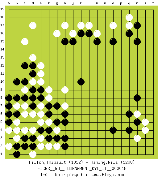 Last move : 1-0 2010 May 26 8:38:15 [Event "FICGS__GO__TOURNAMENT_KYU_II__000018"] [Site "FICGS"] [Date "2010.02.19"] [Round "1"] [Black "Pillon,Thibault"] [White "Raning,Nils"] [Result "1-0"] [Rating 1 "1932"] [Rating 2 "1200"] 1.q16 c4 2.q4 d17 3.e4 d6 4.c3 d4 5.d3 r6 6.o4 s4 7.r8 r3 8.r5 s5 9.q6 c15 10.k16 h17 11.h15 g16 12.h3 d10 13.r15 o17 14.o15 l17 15.l16 k17 16.k10 e5 17.f4 f5 18.c12 d13 19.d12 e12 20.b10 c9 21.c10 q17 22.r17 q18 23.d9 d8 24.e9 e11 25.d11 e10 26.c8 c7 27.b8 m16 28.m15 f9 29.e8 f8 30.d7 e7 31.d8 c6 32.f7 e6 33.g7 h9 34.g5 b3 35.b2 b4 36.a5 b7 37.a7 a6 38.b6 b5 39.a6 a4 40.a8 g6 41.h6 g4 42.h5 e3 43.f3 e2 44.d2 f2 45.g3 d1 46.c2 a2 47.b1 g2 48.h2 j16 49.j15 h7 50.f6 1-0 This go game has been lost on time (started : 2010.02.19 21:59:49) Here are the names of the openings (joseki) played in the four corners : Corner d4 : c4 e4 Komoku (Somok, Xiao~mu`) 3-4 Point. The komoku (3-4) point is the traditional corner enclosure move.. Ikken Takagakari (Hankan Nop'dakeolch'im, Yi Gaogua`jiao~, 1-Space High Approach). The 5-4 approach move has become more popular in modern times, as modern Go emphasizes speed and influence. Corner q4 : q4 r6 Hoshi (Hwajeom, Seongjeom, Xingwei`) 4-4 Point. The star or hoshi (4-4) point, emphasizing influence at the potential expense of territory. Ikken Kakari (Hankan Keolch'im, Yi Gua`jiao~, 1-Space Low Approach). White 2 is the standard approach move to the 4-4. Player Black won this Go (weiqi, baduk) game. Follow this game move after move (download)Fighting must not be the key to go, it should be reserved as your last resource. (Zhong-Pu Liu, about Weiqi) Inventor: A person who makes an ingenious arrangement of wheels, levers and springs, and believes it civilization. (Ambrose Bierce, The Devil's Dictionary)