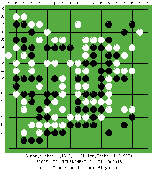 Last move : 0-1 2010 April 22 1:59:46 [Event "FICGS__GO__TOURNAMENT_KYU_II__000018 "] [Site "FICGS"] [Date "2010.02.19"] [Round "1"] [Black "Simon,Mickael "] [White "Pillon,Thibault "] [Result "0-1"] [Rating 1 "1615"] [Rating 2 "1932"] 1.q16 d17 2.q4 d4 3.c15 d12 4.d14 f16 5.b17 k17 6.c10 r14 7.o17 s16 8.r17 r11 9.f3 c6 10.d2 c3 11.c2 f4 12.g3 e3 13.e2 g4 14.h3 b12 15.e10 f12 16.f14 g15 17.g14 g12 18.g10 d11 19.d10 j12 20.j14 h15 21.h14 h10 22.g8 h9 23.f8 h4 24.j4 r6 25.r5 q6 26.o3 h8 27.g6 h6 28.e5 e4 29.d7 c7 30.c8 b8 31.d8 f6 32.f5 g7 33.f7 g5 34.e6 j5 35.k4 k5 36.l4 l5 37.m4 n5 38.q10 q11 39.p10 o14 40.m12 l13 41.m13 l14 42.n14 n15 43.o13 p14 44.p13 q13 45.l12 k12 46.m14 m15 47.o15 l15 48.l10 p11 49.o11 o10 50.n11 o9 51.n9 p12 52.o12 l11 53.n10 o8 54.n8 o7 55.n6 o6 56.m5 e9 57.b9 n7 58.m6 m7 59.m8 l9 60.k10 k11 61.l8 k9 62.l6 l7 63.k7 k8 64.k6 b18 65.c17 c18 66.d16 e17 67.b13 b11 68.b10 b14 69.b15 e15 70.d13 c13 71.c14 a13 0-1 Here are the names of the openings (joseki) played in the four corners : Corner d16 : d17 c15Komoku (Somok, Xiao~mu`) 3-4 Point. The komoku (3-4) point is the traditional corner enclosure move..Ikken Kakari (Hankan Keolch'im, Yi Gua`jiao~, 1-Space Low Pincer). The small knight move is the basic approach move to the 3-4 point stone. It has been continually used for over four centuries. There are limitless variations, with new moves constantly being discovered. Black 2 opens the door to a treaure store of joseki. Corner q16 : q16 r14Hoshi (Hwajeom, Seongjeom, Xingwei`) 4-4 Point. The star or hoshi (4-4) point, emphasizing influence at the potential expense of territory.Ikken Kakari (Hankan Keolch'im, Yi Gua`jiao~, 1-Space Low Approach). White 2 is the standard approach move to the 4-4. Corner d4 : d4 f3Hoshi (Hwajeom, Seongjeom, Xingwei`) 4-4 Point. The star or hoshi (4-4) point, emphasizing influence at the potential expense of territory.Ikken Kakari (Hankan Keolch'im, Yi Gua`jiao~, 1-Space Low Approach). Black 2 is the standard approach move to the 4-4. Corner q4 : q4 r6Hoshi (Hwajeom, Seongjeom, Xingwei`) 4-4 Point. The star or hoshi (4-4) point, emphasizing influence at the potential expense of territory.Ikken Kakari (Hankan Keolch'im, Yi Gua`jiao~, 1-Space Low Approach). White 2 is the standard approach move to the 4-4. Player White won this Go (weiqi, baduk) game.Follow this game move after move (download ) Don't get surrounded ! Ever ! (Anonymous) Shallow men believe in luck. Strong men belive in cause and effect. (Ralph Waldo Emerson)