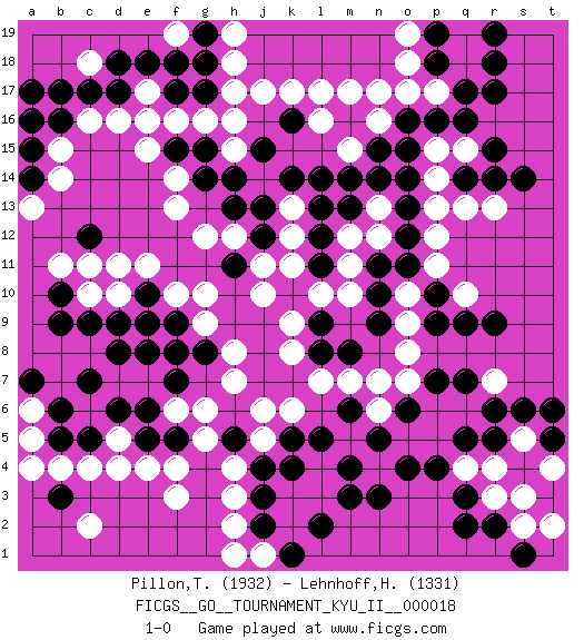 Last move : 1-0 2010 July 25 14:19:16 [Event "FICGS__GO__TOURNAMENT_KYU_II__000018"] [Site "FICGS"] [Date "2010.02.19"] [Round "1"] [Black "Pillon,Thibault"] [White "Lehnhoff,Heinz-Georg"] [Result "1-0"] [Rating 1 "1932"] [Rating 2 "1331"] 1.q16 d4 2.q3 d16 3.q9 o17 4.q14 q18 5.r17 l17 6.k4 h3 7.h5 f3 8.q5 d10 9.c17 c16 10.d17 e17 11.e18 d7 12.m16 m17 13.o16 c18 14.f17 e16 15.d18 r7 16.r9 s5 17.q7 m5 18.m4 n4 19.m3 n6 20.n3 s3 21.r2 r4 22.r6 q4 23.p4 s2 24.s6 k6 25.c12 f16 26.g17 r3 27.q2 h15 28.c9 c10 29.b10 b11 30.d9 f10 31.e10 e11 32.e9 d11 33.b9 c11 34.d6 c6 35.e6 e7 36.f9 g9 37.f8 h7 38.f7 g10 39.c5 c4 40.b5 p11 41.t6 n16 42.n15 n17 43.t5 o9 44.p10 o10 45.o11 n13 46.o12 p15 47.o15 p14 48.p16 p12 49.o13 p13 50.o14 q15 51.r15 m15 52.m14 l16 53.l14 m12 54.l12 m11 55.h13 f13 56.g14 f14 57.l11 l10 58.b3 c2 59.r18 q19 60.r19 q13 61.r14 q10 62.p9 o7 63.o4 r13 64.s14 t4 65.r5 j17 66.j3 h2 67.j2 j5 68.b16 b15 69.b17 a16 70.m13 k13 71.k14 m10 72.p18 o18 73.p19 n12 74.n14 d5 75.c7 b4 76.b6 j14 77.j13 k12 78.l13 k11 79.g15 g16 80.j15 h16 81.h14 j1 82.k1 h1 83.l2 h18 84.a17 f19 85.f18 a5 86.a15 b14 87.f15 e15 88.h11 j10 89.n10 g6 90.k5 j6 91.f5 f6 92.e5 t2 93.s1 a6 94.a7 a4 95.g19 o8 96.n11 g5 97.a14 a13 98.a16 f4 99.d8 g12 100.n9 h12 101.n5 m7 102.l5 p17 103.q17 e4 104.e8 h19 105.g18 h17 106.m6 o19 107.m8 l7 108.l9 k9 109.l8 k8 110.g8 h8 111.j12 j11 112.k16 k17 113.j4 h4 114.o6 n7 115.p7 1-0 Here are the names of the openings (joseki) played in the four corners : Corner q16 : q16 o17 Hoshi (Hwajeom, Seongjeom, Xingwei`) 4-4 Point. The star or hoshi (4-4) point, emphasizing influence at the potential expense of territory. Ikken Kakari (Hankan Keolch'im, Yi Gua`jiao~, 1-Space Low Approach). White 2 is the standard approach move to the 4-4. Corner d16 : d16 c17 Hoshi (Hwajeom, Seongjeom, Xingwei`) 4-4 Point. The star or hoshi (4-4) point, emphasizing influence at the potential expense of territory. Player Black won this Go (weiqi, baduk) game. Follow this game move after move (download)Extend one hand from the cutting points. (Anonymous) The difference between perseverance and obstinacy is that one comes from a strong will, and the other from a strong won't. (Henry Ward Beecher)