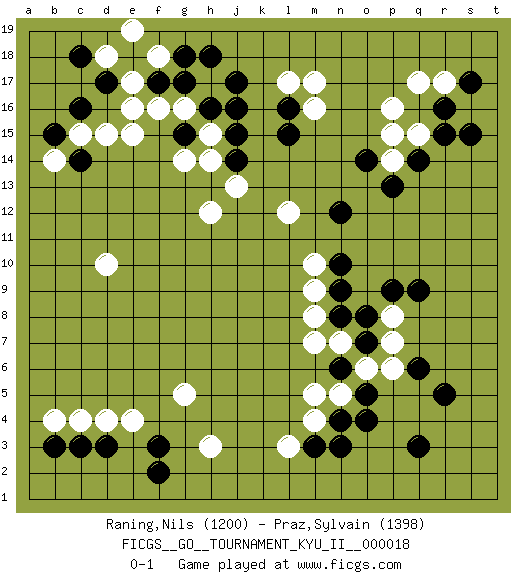 Last move : 0-1 2010 May 27 8:37:10 [Event "FICGS__GO__TOURNAMENT_KYU_II__000018 "] [Site "FICGS"] [Date "2010.02.19"] [Round "1"] [Black "Raning,Nils "] [White "Praz,Sylvain "] [Result "0-1"] [Rating 1 "1200"] [Rating 2 "1398"] 1.d17 d4 2.r16 c15 3.q3 p16 4.q14 r17 5.s17 q17 6.s15 l17 7.g17 d10 8.r5 l3 9.f3 h3 10.c3 c4 11.d3 e4 12.f2 g5 13.q9 e15 14.g15 f16 15.f17 g16 16.h16 h17 17.j17 h15 18.j16 g14 19.j15 h14 20.l16 m17 21.j14 h12 22.o4 j13 23.o14 l12 24.n12 b4 25.b3 m10 26.n10 m9 27.n9 m8 28.n8 m7 29.m3 m4 30.n3 n5 31.o5 o6 32.n6 n7 33.o7 p6 34.q6 p7 35.o8 p8 36.p9 e17 37.e18 e16 38.c16 f18 39.g18 d18 40.c18 e19 41.h18 m16 42.l15 q15 43.r15 p14 44.p13 p15 45.n4 m5 46.b15 b14 47.c14 d15 0-1 This go game has been lost on time (started : 2010.02.19 21:59:49) Here are the names of the openings (joseki) played in the four corners : Corner d16 : d17 c15Komoku (Somok, Xiao~mu`) 3-4 Point. The komoku (3-4) point is the traditional corner enclosure move..Ikken Kakari (Hankan Keolch'im, Yi Gua`jiao~, 1-Space Low Pincer). The small knight move is the basic approach move to the 3-4 point stone. It has been continually used for over four centuries. There are limitless variations, with new moves constantly being discovered. White 2 opens the door to a treaure store of joseki. Corner q16 : r16 p16Komoku (Somok, Xiao~mu`) 3-4 Point. The komoku (3-4) point is the traditional corner enclosure move..Ikken Takagakari (Hankan Nop'dakeolch'im, Yi Gaogua`jiao~, 1-Space High Approach). The 5-4 approach move has become more popular in modern times, as modern Go emphasizes speed and influence. Corner d4 : d4 f3Hoshi (Hwajeom, Seongjeom, Xingwei`) 4-4 Point. The star or hoshi (4-4) point, emphasizing influence at the potential expense of territory.Ikken Kakari (Hankan Keolch'im, Yi Gua`jiao~, 1-Space Low Approach). Black 2 is the standard approach move to the 4-4. Player White won this Go (weiqi, baduk) game.Follow this game move after move (download ) Avoid the plate connection. (Anonymous) He who is a good ruler must first have been ruled. (Aristotle)