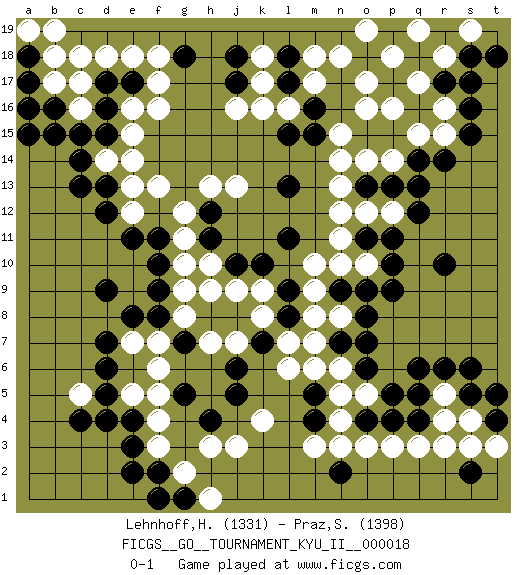 Last move : 0-1 2010 June 2 0:52:4 [Event "FICGS__GO__TOURNAMENT_KYU_II__000018 "] [Site "FICGS"] [Date "2010.02.19"] [Round "1"] [Black "Lehnhoff,Heinz-Georg "] [White "Praz,Sylvain "] [Result "0-1"] [Rating 1 "1331"] [Rating 2 "1398"] 1.d4 q3 2.q16 c17 3.q5 r5 4.r6 r4 5.q6 o3 6.r10 k16 7.d16 c16 8.d15 o17 9.p17 o16 10.q14 e18 11.d17 d18 12.m16 m17 13.l15 f16 14.l17 m18 15.l18 l16 16.j17 j16 17.m15 k17 18.d12 f3 19.e3 f4 20.d6 k4 21.c15 o14 22.b16 b17 23.d9 f13 24.h4 h3 25.j5 j3 26.f2 g2 27.m5 o5 28.o6 n5 29.m4 l6 30.s5 m6 31.q4 r3 32.l13 o12 33.q12 j13 34.l11 n10 35.k10 h10 36.l8 n8 37.h8 j9 38.j8 k9 39.l9 k8 40.k7 l7 41.o18 n18 42.h11 g10 43.j10 h9 44.f10 g11 45.f11 g12 46.o15 n15 47.p15 n14 48.j6 n6 49.o7 m8 50.p9 g8 51.j18 k18 52.p4 p3 53.p13 n12 54.e2 f6 55.g7 f7 56.f8 g9 57.e8 p18 58.q18 o19 59.h12 h13 60.b15 q19 61.o4 n4 62.g5 f5 63.a17 r18 64.r17 q17 65.o13 n13 66.q18 c5 67.d5 q17 68.o8 p16 69.s17 e14 70.d13 s4 71.s18 s19 72.c4 r16 73.s16 q15 74.r14 p14 75.a18 c18 76.s6 r15 77.s15 e15 78.e17 f17 79.p11 p12 80.q13 o10 81.g1 h1 82.p10 h7 83.f1 m3 84.o9 m10 85.t4 t3 86.t5 e7 87.d7 d14 88.c14 e12 89.e11 b18 90.s2 s3 91.o11 n11 92.n9 m9 93.f9 j7 94.t18 b19 95.p5 a16 96.a15 a19 97.a16 e13 98.n7 e16 99.c13 m7 100.g18 f18 101.e4 e5 102.n2 n3 0-1 Here are the names of the openings (joseki) played in the four corners : Corner q4 : q3 q5Komoku (Somok, Xiao~mu`) 3-4 Point. The komoku (3-4) point is the traditional corner enclosure move..Ikken Takagakari (Hankan Nop'dakeolch'im, Yi Gaogua`jiao~, 1-Space High Approach). The 5-4 approach move has become more popular in modern times, as modern Go emphasizes speed and influence. Corner d16 : c17 d16San-San (Sam-Sam, San-San) 3-3 Point. The San-San (3-3) point, emphasizing territory at the expense of influence.Kata-tsuki (shoulder hit). The shoulder-hit is the traditional answer to the 3-3. The direction of White 3 depends on the positions on the side. Crawling once may be the premise for a follow-up move of sliding with a knight's move in the opposite direction. If White plays 3 at 3-4 (to the right), the follow-on knight's move is then played at the top (e.g. 3-4, 4-5, 5-2). White's knight's move reduces territory potential on the side it is played. Corner q16 : q16 o17Hoshi (Hwajeom, Seongjeom, Xingwei`) 4-4 Point. The star or hoshi (4-4) point, emphasizing influence at the potential expense of territory.Ikken Kakari (Hankan Keolch'im, Yi Gua`jiao~, 1-Space Low Approach). White 2 is the standard approach move to the 4-4. Corner d4 : d4 f3Hoshi (Hwajeom, Seongjeom, Xingwei`) 4-4 Point. The star or hoshi (4-4) point, emphasizing influence at the potential expense of territory.Ikken Kakari (Hankan Keolch'im, Yi Gua`jiao~, 1-Space Low Approach). White 2 is the standard approach move to the 4-4. Player White won this Go (weiqi, baduk) game.Follow this game move after move (download ) Don't make compact groups of stones. (Anonymous) Opportunities multiply as they are seized. (Sun Tzu)