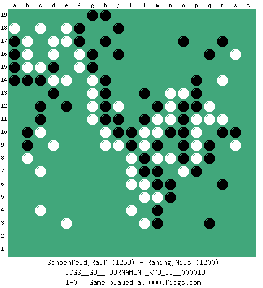 Last move : 1-0 2010 June 11 9:29:35 [Event "FICGS__GO__TOURNAMENT_KYU_II__000018"] [Site "FICGS"] [Date "2010.02.19"] [Round "1"] [Black "Schoenfeld,Ralf"] [White "Raning,Nils"] [Result "1-0"] [Rating 1 "1253"] [Rating 2 "1200"] 1.q16 c4 2.q3 d17 3.q9 e3 4.d15 f16 5.c12 r14 6.o17 s16 7.r17 r11 8.r6 d9 9.b9 c7 10.j16 k4 11.m3 l3 12.m4 k6 13.l7 l6 14.m6 k7 15.l8 k8 16.k9 l9 17.m9 l10 18.j10 j9 19.k10 h9 20.p14 p11 21.o10 p10 22.l11 p9 23.p7 p8 24.q8 o7 25.o8 n8 26.o9 m10 27.n10 m11 28.m12 n11 29.o11 n12 30.o12 n13 31.l13 o13 32.p12 q12 33.p13 h10 34.j11 j12 35.h11 g11 36.h12 m8 37.m7 m5 38.n5 l5 39.n6 g12 40.h13 g13 41.h14 g14 42.g15 f15 43.g16 g17 44.h17 c15 45.c14 b15 46.b14 c10 47.b10 b8 48.c11 d14 49.d13 e14 50.a15 b17 51.e12 d16 52.a17 a18 53.a16 b16 54.a14 c18 55.f17 g18 56.f18 h18 57.j18 e18 58.g19 e17 59.h19 s9 60.r10 q11 61.s10 1-0 This go game has been lost on time (started : 2010.02.19 21:59:49) Here are the names of the openings (joseki) played in the four corners : Corner d16 : d17 d15 Komoku (Somok, Xiao~mu`) 3-4 Point. The komoku (3-4) point is the traditional corner enclosure move.. Ikken Takagakari (Hankan Nop'dakeolch'im, Yi Gaogua`jiao~, 1-Space High Approach). The 5-4 approach move has become more popular in modern times, as modern Go emphasizes speed and influence. Corner q16 : q16 r14 Hoshi (Hwajeom, Seongjeom, Xingwei`) 4-4 Point. The star or hoshi (4-4) point, emphasizing influence at the potential expense of territory. Ikken Kakari (Hankan Keolch'im, Yi Gua`jiao~, 1-Space Low Approach). White 2 is the standard approach move to the 4-4. Player Black won this Go (weiqi, baduk) game. Follow this game move after move (download)Take the cutting stone on the second line. (Anonymous) The obstacle is the path. (Zen proverb)