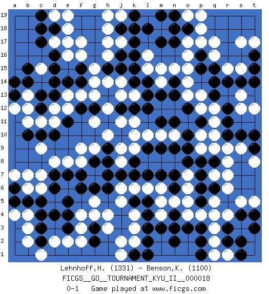 Last move : 0-1 2010 June 15 0:5:54 [Event "FICGS__GO__TOURNAMENT_KYU_II__000018"] [Site "FICGS"] [Date "2010.02.19"] [Round "1"] [Black "Lehnhoff,Heinz-Georg"] [White "Benson,Kyle"] [Result "0-1"] [Rating 1 "1331"] [Rating 2 "1100"] 1.d4 q17 2.d16 q3 3.q15 q16 4.p15 r15 5.r14 s15 6.s14 o16 7.r10 r6 8.p16 p17 9.g3 k3 10.l4 k4 11.k5 j5 12.l5 h4 13.o3 q4 14.l3 h3 15.p2 o15 16.d10 f17 17.d14 h16 18.k17 j17 19.r2 p13 20.p6 r8 21.q8 q7 22.k16 h14 23.p7 q9 24.m17 q10 25.r11 q11 26.q13 q12 27.r12 s9 28.o18 o17 29.n17 c6 30.s10 s13 31.t14 s12 32.c4 d8 33.d18 d12 34.f12 e13 35.f14 f13 36.e14 g13 37.q14 o14 38.t10 t12 39.e5 f3 40.f6 f8 41.h6 d2 42.c2 e2 43.g2 g4 44.l2 k2 45.h8 g9 46.h9 g11 47.g12 h12 48.t15 s17 49.p8 r9 50.k14 j6 51.g8 f9 52.e11 b12 53.b10 c9 54.h11 h10 55.j10 j11 56.s4 s5 57.r3 r4 58.b14 k10 59.c12 c11 60.c13 b11 61.b5 b6 62.j7 k6 63.k7 l6 64.l7 m6 65.m7 l15 66.j18 h18 67.o10 o5 68.p5 p4 69.k15 l16 70.l14 m14 71.c10 d11 72.t16 t17 73.l18 p18 74.n6 n5 75.n19 j19 76.k18 p19 77.k19 h19 78.l12 m10 79.l9 l10 80.h15 g15 81.j16 h17 82.j15 g14 83.m19 o19 84.n18 c15 85.k1 j1 86.l1 j2 87.t4 t5 88.s2 q2 89.n4 m5 90.p1 q1 91.t3 r1 92.s1 m4 93.n2 j9 94.o12 p12 95.a6 a7 96.a5 b7 97.m13 m15 98.b15 e18 99.c17 c1 100.n13 o6 101.n7 b13 102.m9 n10 103.n9 o7 104.o8 g7 105.f7 j8 106.h7 g5 107.g6 d19 108.c19 e19 109.e17 e16 110.d15 d17 111.c18 b2 112.c3 o4 113.n3 b3 114.n11 b4 115.c5 a4 116.e7 e8 117.f15 f16 118.a13 a12 119.n14 n15 120.d13 e12 121.a14 p9 122.o9 q5 123.d7 c7 124.t9 t8 125.k8 k9 126.q6 r7 127.e3 f2 128.d6 f4 129.e4 e17 130.j12 j13 131.k12 k13 132.m11 k11 133.m3 j14 134.p11 p10 135.l13 o13 136.p3 pass 0-1 Here are the names of the openings (joseki) played in the four corners : Corner q16 : q17 q15 Komoku (Somok, Xiao~mu`) 3-4 Point. The komoku (3-4) point is the traditional corner enclosure move.. Ikken Takagakari (Hankan Nop'dakeolch'im, Yi Gaogua`jiao~, 1-Space High Approach). The 5-4 approach move has become more popular in modern times, as modern Go emphasizes speed and influence. Corner d16 : d16 f17 Hoshi (Hwajeom, Seongjeom, Xingwei`) 4-4 Point. The star or hoshi (4-4) point, emphasizing influence at the potential expense of territory. Ikken Kakari (Hankan Keolch'im, Yi Gua`jiao~, 1-Space Low Approach). White 2 is the standard approach move to the 4-4. Player White won this Go (weiqi, baduk) game. Follow this game move after move (download)I really believe that Go is destined to take the place of Chess as the leading intellectual game of the Occident, just as it has reigned supreme in the Orient for some four thousand years. (Edward Lasker, international chess master) A mistake is only a mistake if you let it happen twice. Otherwise it is a learning experience. (Daniel Parmet)