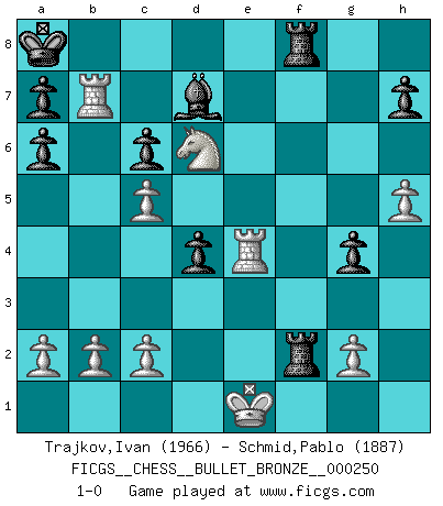 Last move : 1-0 2010 April 25 0:40:16 [Event "FICGS__CHESS__BULLET_BRONZE__000250"] [Site "FICGS"] [Date "2010.04.24"] [Round "1"] [White "Trajkov,Ivan"] [Black "Schmid,Pablo"] [Result "1-0"] [WhiteElo "1966"] [BlackElo "1887"] 1.e4 e5 2.f4 exf4 3.Nf3 d6 4.d4 g5 5.h4 g4 6.Ng1 f5 7.Bxf4 fxe4 8.Nc3 d5 9.Qd2 c6 10.Nge2 Be6 11.O-O-O Ne7 12.Ng3 Ng6 13.Bg5 Be7 14.Bxe7 Qxe7 15.h5 Nf8 16.Qf4 Na6 17.Bxa6 bxa6 18.Rhe1 O-O-O 19.Re3 Qc7 20.Qh6 Kb8 21.Rf1 Bd7 22.Na4 Ne6 23.Rf7 Rc8 24.Nc5 Nxc5 25.dxc5 Ka8 26.Nf5 Qe5 27.Qd6 Qxd6 28.Nxd6 Rcd8 29.Rb3 Rhf8 30.Re7 d4 31.Rb7 Rf1+ 32.Kd2 Rf2+ 33.Ke1 Rdf8 34.Rxe4 1-0 KGA : Fischer defense Queenside Castling by player White (move 11) Queenside Castling by player Black (move 18) Player White won this chess game. Follow this game move after move (download)Chess is everything: art, science and sport. (Anatoly Karpov) Ein Springer auf f6 gegen die eigene Rochadestellung ist schlimmer als ein rostiger Nagel im Knie. (Efim Bogoljubov) El Ajedrez es una guerra en un tablero. El objetivo es aplastar la mente del oponente. (Bobby Fischer) On entre au jeu d'Echecs comme on entre en Religion. Pour le joueur d'Echecs, la partie d'Echecs c'est l'office, la messe, le défilé du 1er Mai, le dépôt de gerbe au Monument aux Morts. C'est un drame sacré. (Michel Roos) Don't be irreplaceable, if you can't be replaced, you can't be promoted. (Dan Rotaru)
