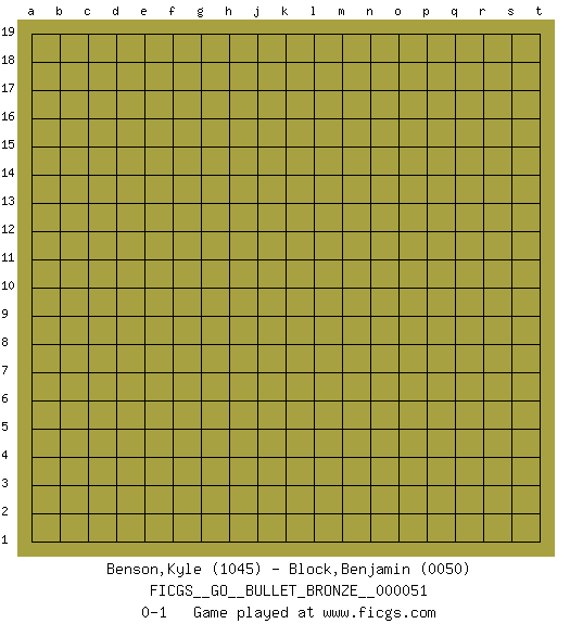 Last move : 0-1 2010 February 22 16:47:6 [Event "FICGS__GO__BULLET_BRONZE__000051"] [Site "FICGS"] [Date "2010.02.22"] [Round "1"] [Black "Benson,Kyle"] [White "Block,Benjamin"] [Result "0-1"] [Rating 1 "1045"] [Rating 2 "0050"] 0-1 This go game has been lost on time (started : 2010.02.22 13:31:23) Here are the names of the openings (joseki) played in the four corners : Player White won this Go (weiqi, baduk) game. Follow this game move after move (download)When in doubt, remove the enemy stones from the board. (Bill Taylor) The large trees attract high winds. (Chinese proverb)