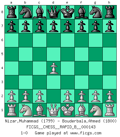 Last move : 1-0 2010 April 13 8:55:42 [Event "FICGS__CHESS__RAPID_B__000143"] [Site "FICGS"] [Date "2010.02.23"] [Round "1"] [White "Nizar,Muhammad"] [Black "Bouderbala,Ahmed"] [Result "1-0"] [WhiteElo "1799"] [BlackElo "1800"] 1.d4 1-0 This chess game has been lost on time (started : 2010.02.23 1:27:42) Queen's pawn Player White won this chess game. Follow this game move after move (download)My style is somewhere between that of Tal and Petrosian. (Reshevsky) Schach ist die gewalttätigste aller Sportarten. (Garry Kasparov) Debes de llevar a tu oponente hacia un profundo y obscuro bosque donde 2+2=5, y el camino que conduce a la salida es suficientemente ancho para solamente uno. (Mikhail Tal) Fischer est le meilleur joueur du monde et Karpov n'est qu'un joueur de bistrot. (Garry Kasparov, agé de 16 ans) Knowledge rests not upon truth alone, but upon error also. (Carl G. Jung)